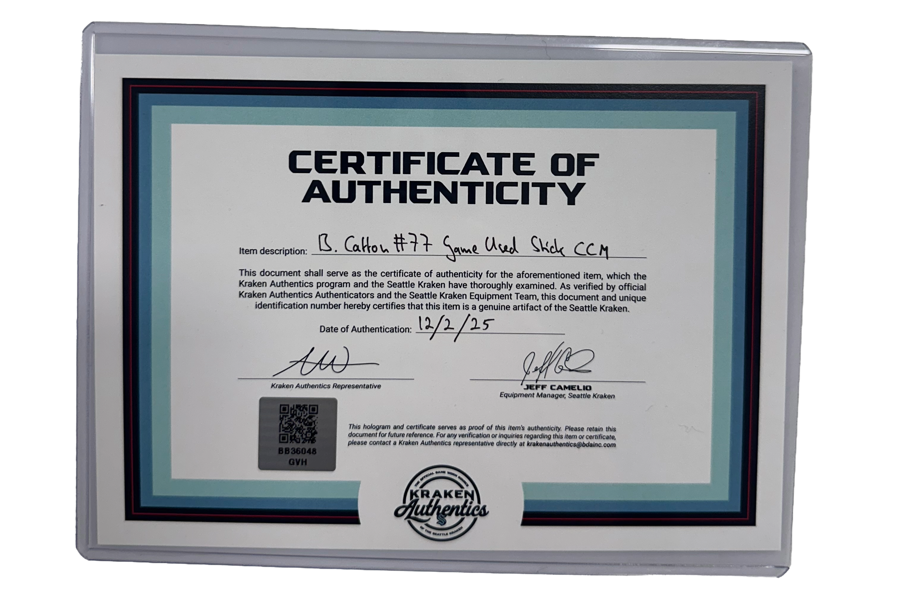 Own a piece of Seattle Kraken history with this game-used hockey stick, used by Berkly Catton during the 2025-2026 NHL season with the Seattle Kraken.