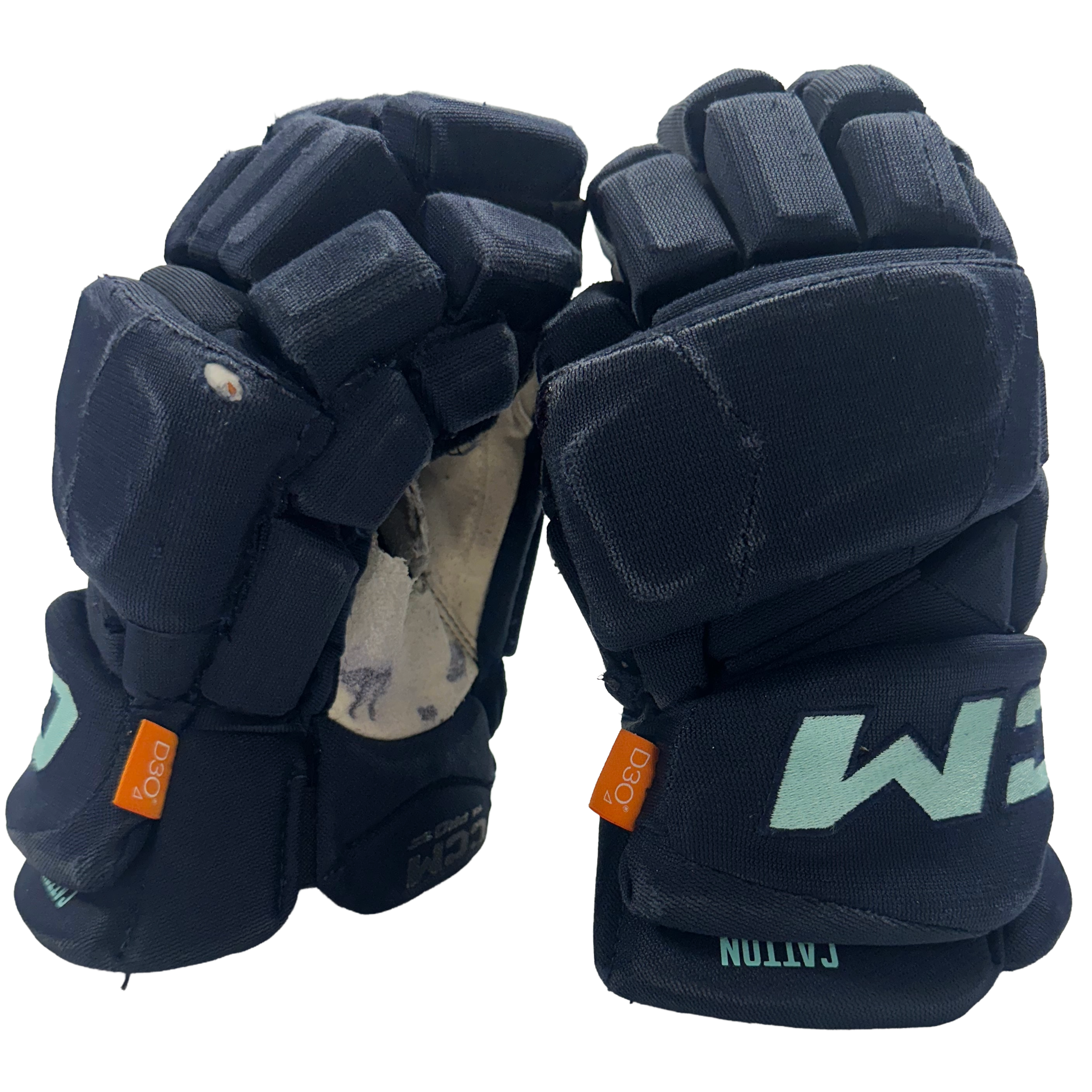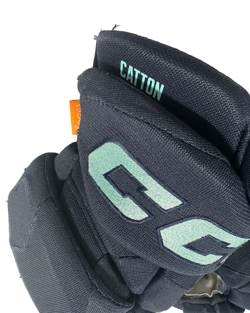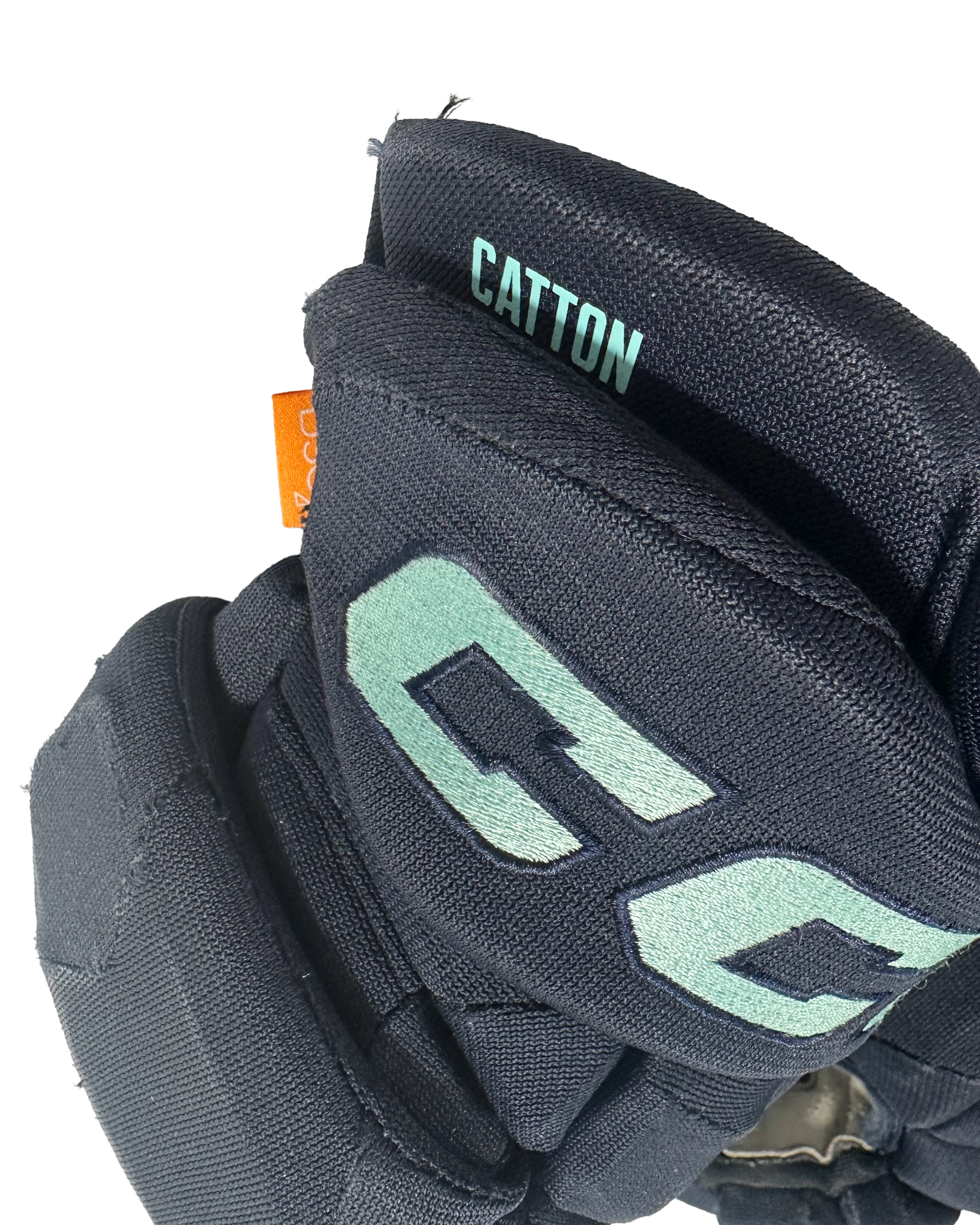 Details: These gloves were worn by Berkly Catton during official NHL game action in the 2025–26 season with the Seattle Kraken.