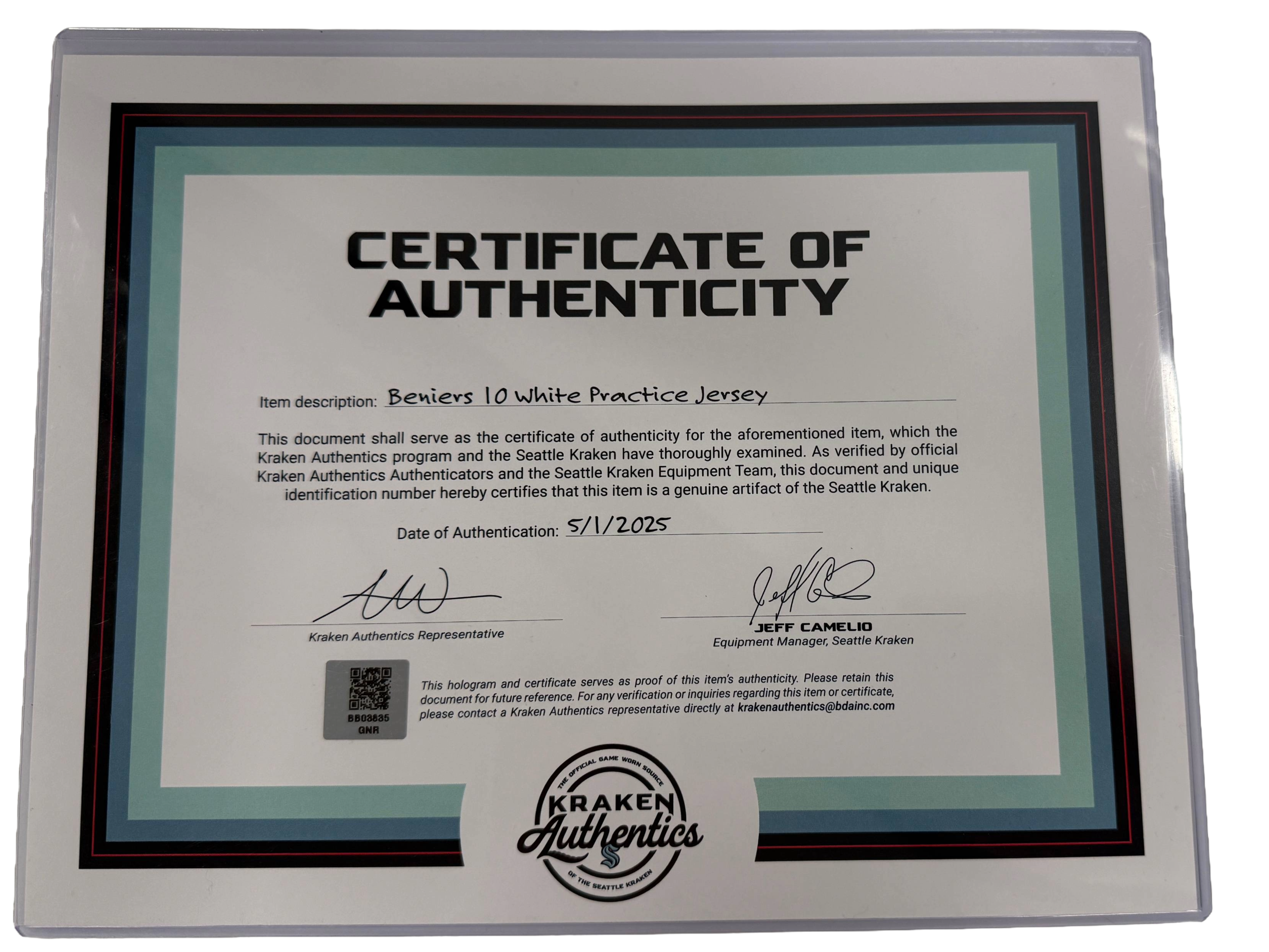 Each jersey includes an official Kraken Authentics Certificate of Authenticity, verifying that this is a genuine worn item.