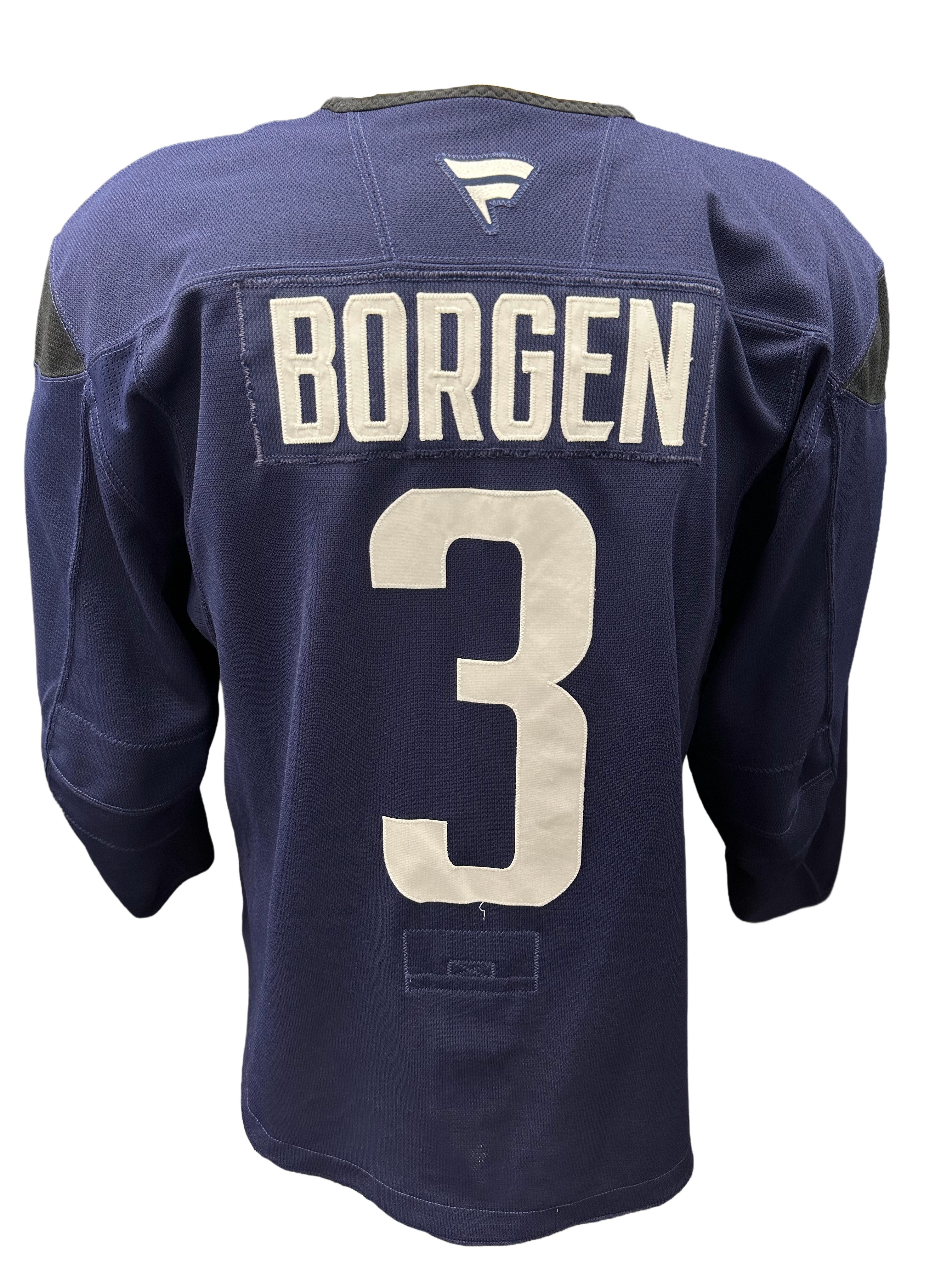 This official Seattle Kraken practice jersey was worn by Will Borgen during team practices and training sessions. As a genuine used team-issued item, it may display visible signs of wear such as puck marks, board paint, minor fabric wear, or other authentic use from on-ice action.