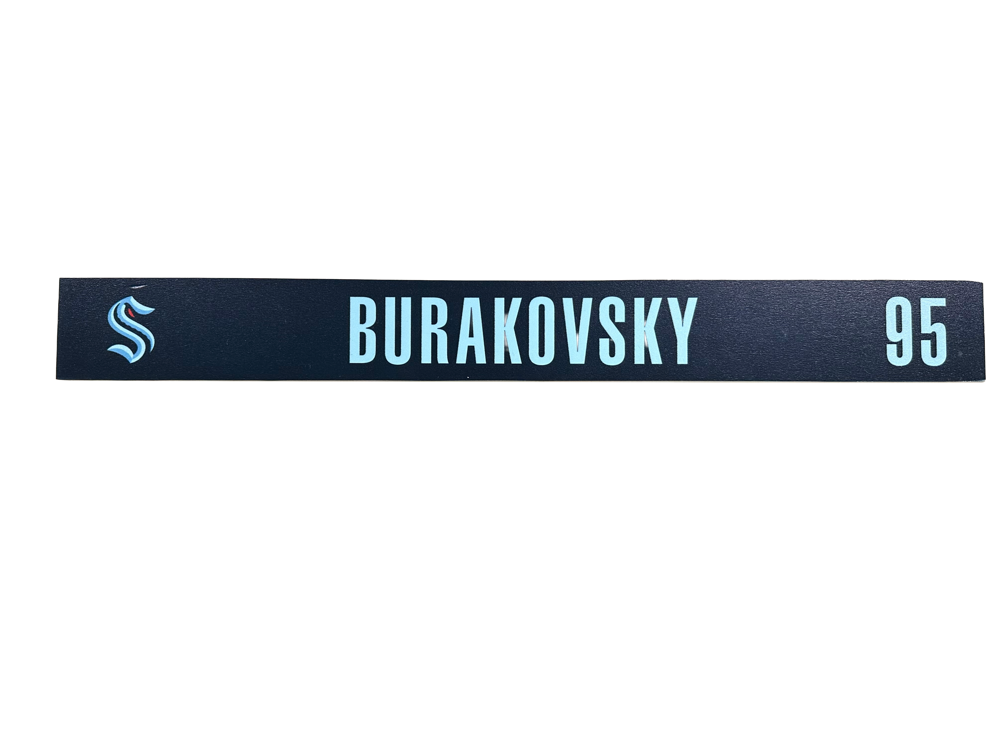 Details: Features the Seattle Kraken logo and players's name as displayed above their locker during the season.