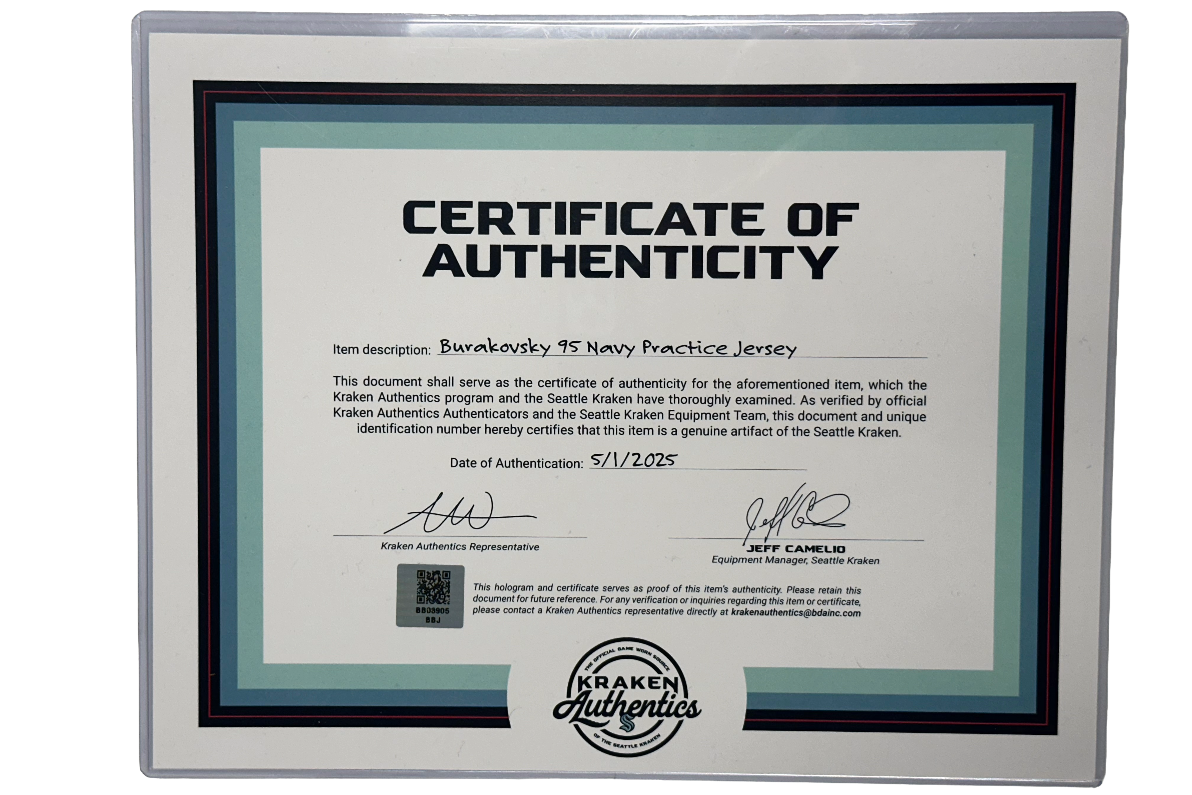 Each jersey includes an official Kraken Authentics Certificate of Authenticity, verifying that this is a genuine team-worn item.