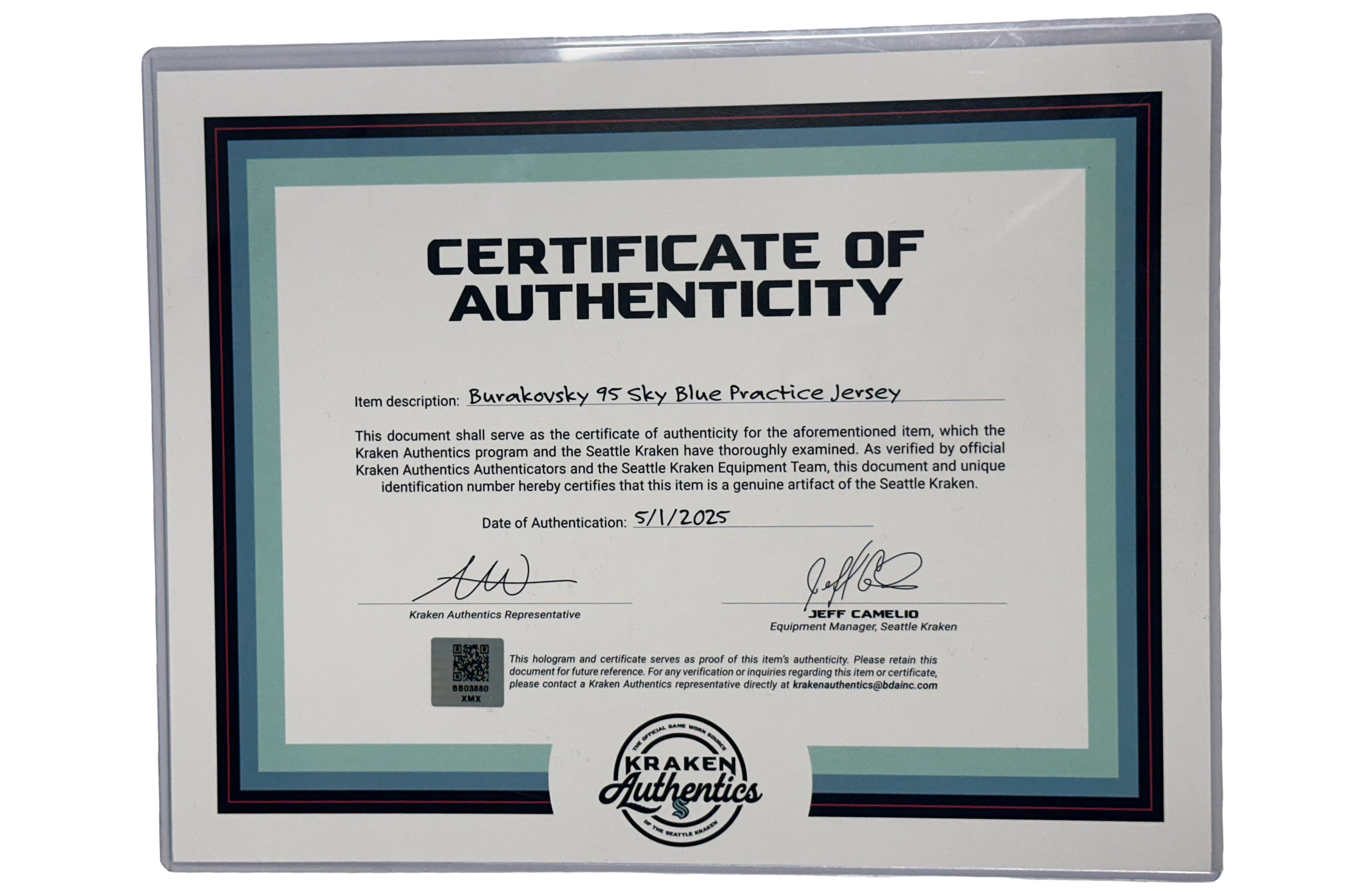 Each jersey includes an official Kraken Authentics Certificate of Authenticity, verifying that this is a genuine team-worn item.