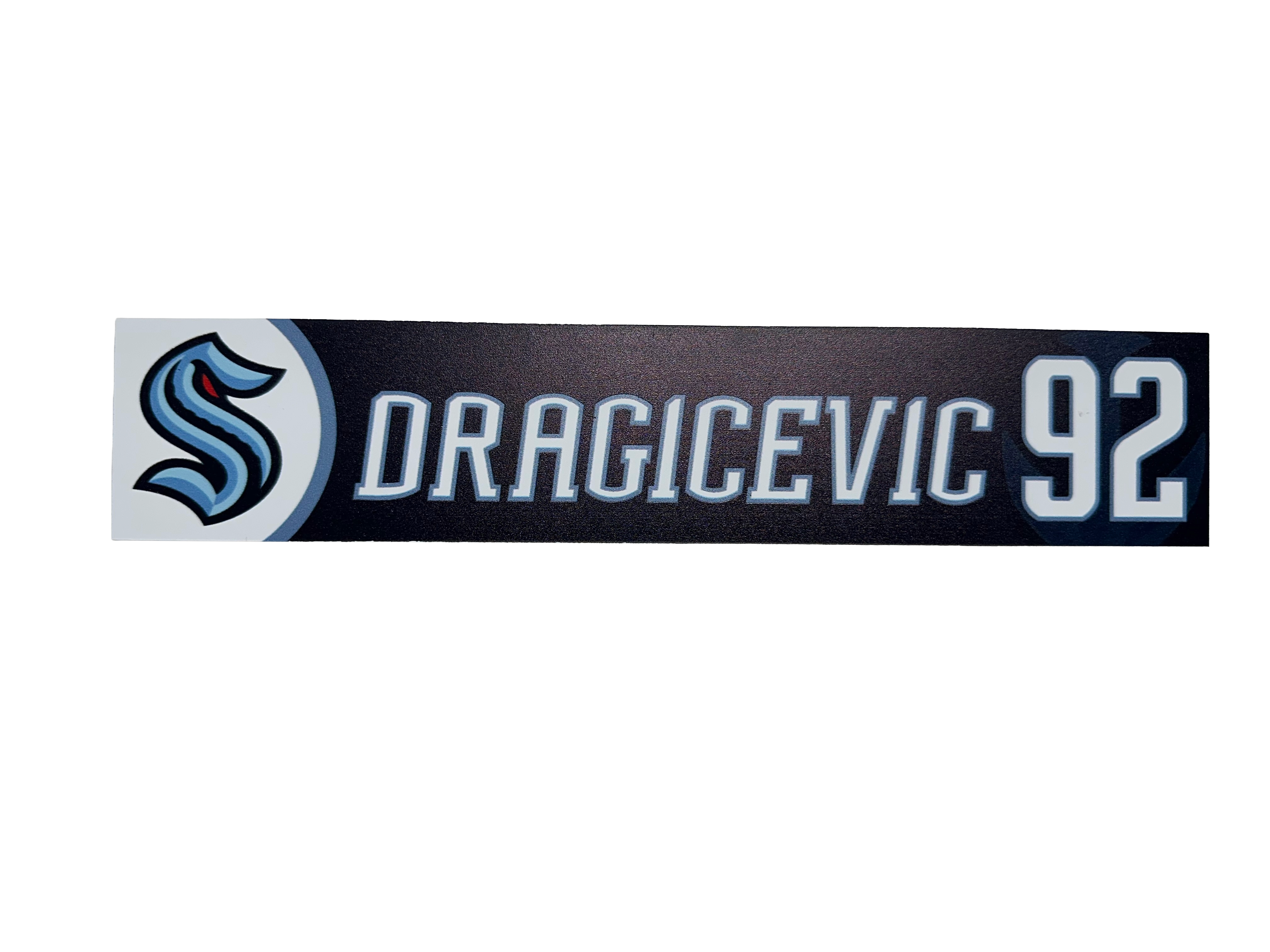 Details: Features the Seattle Kraken logo and player’s name/number as displayed above their locker during the season.