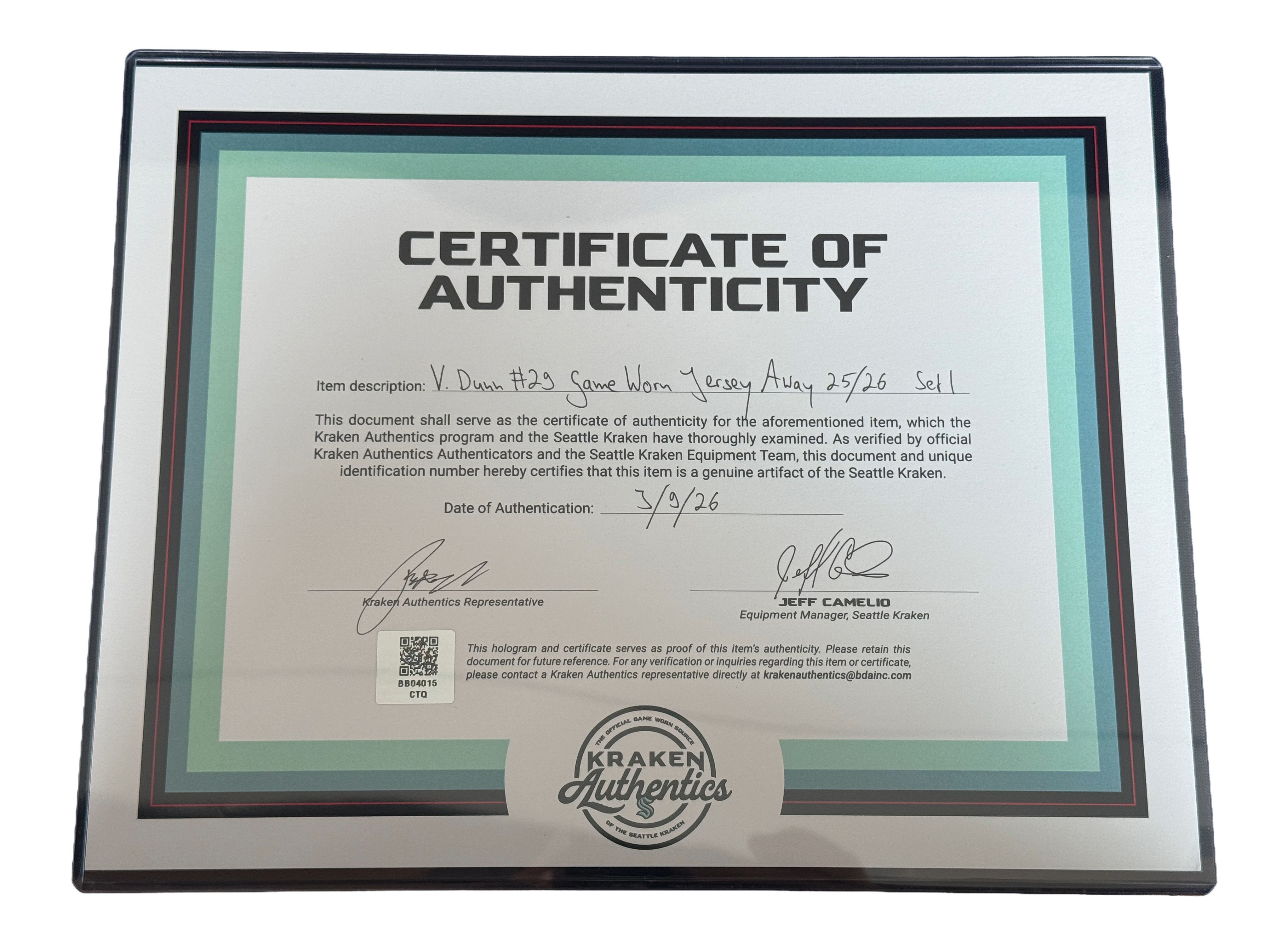 The jersey is part of the Kraken Authentics online auction. Select jerseys from this auction will be displayed at the Kraken Authentics shop located behind Section 108 at Climate Pledge Arena during the auction period.