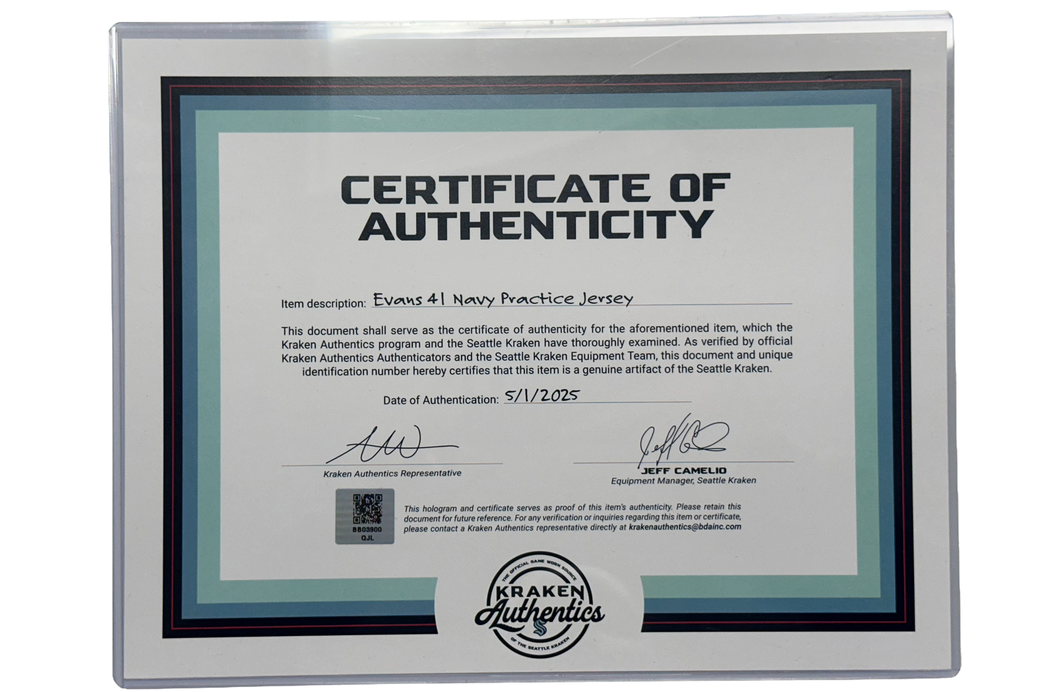 Each jersey includes an official Kraken Authentics Certificate of Authenticity, verifying that this is a genuine team-worn item.