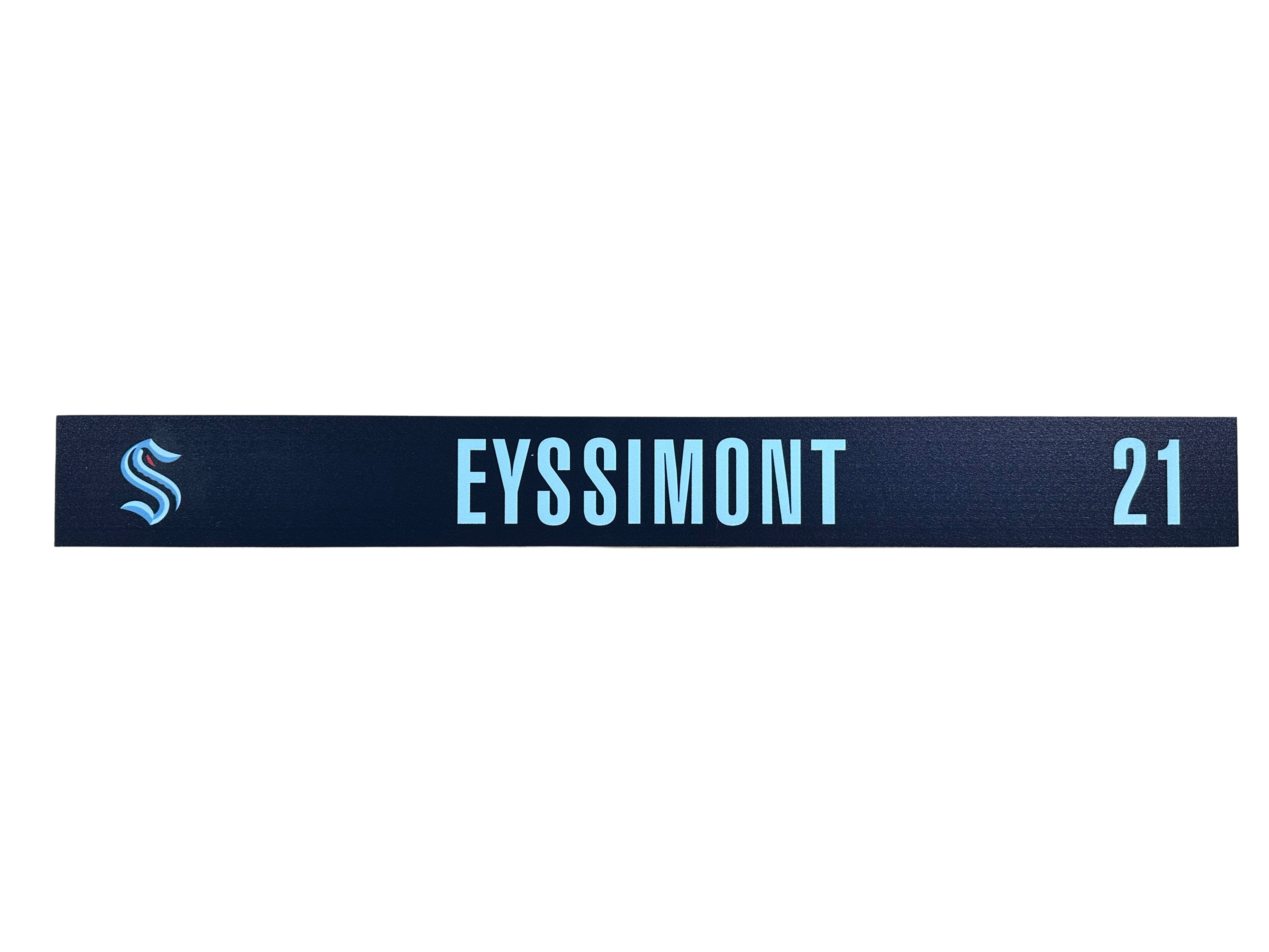 Details: Features the Seattle Kraken logo and players's name as displayed above their locker during the season.