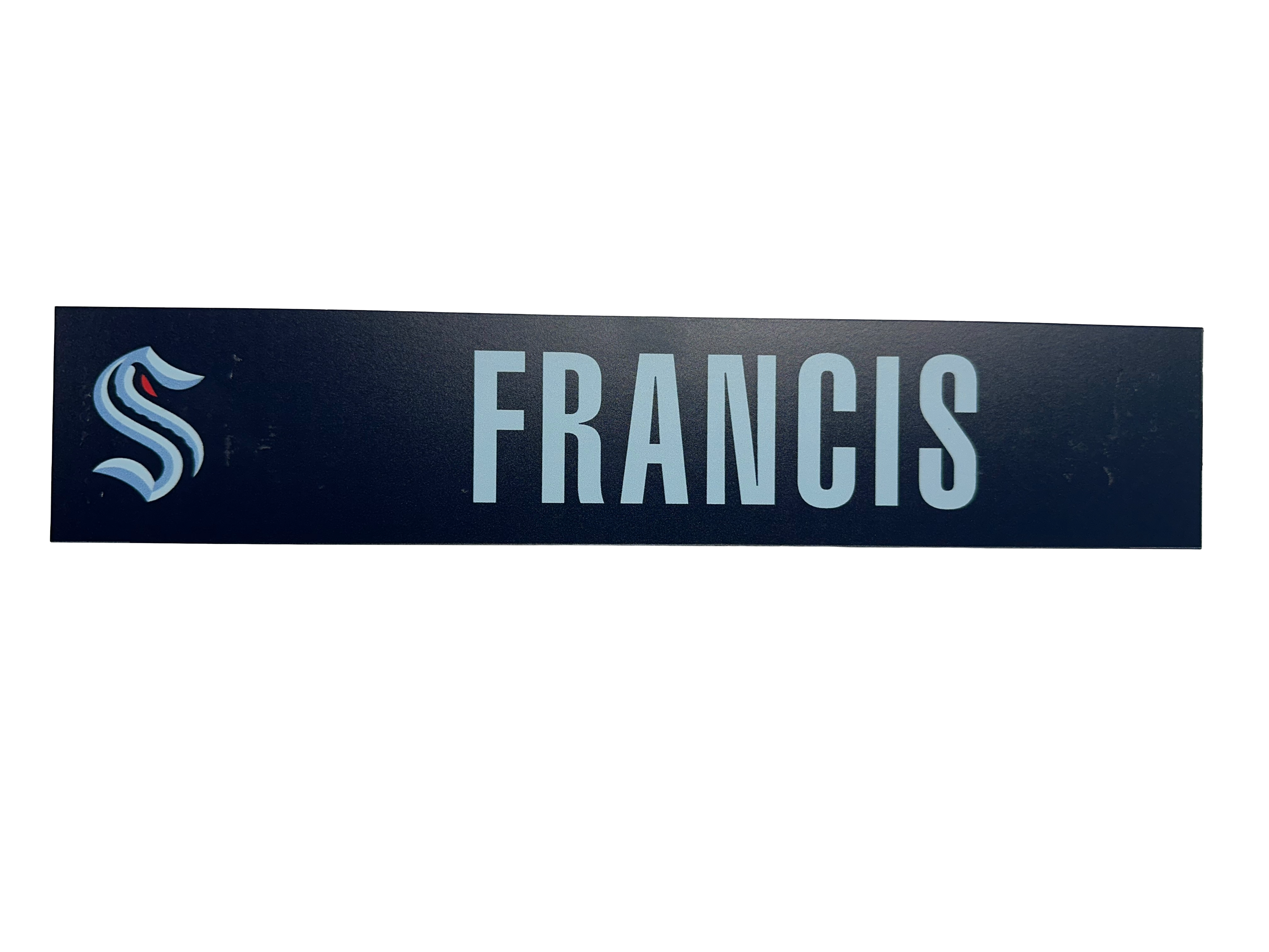 Details: Features the Seattle Kraken logo and staff's name as displayed above their locker during the season.
