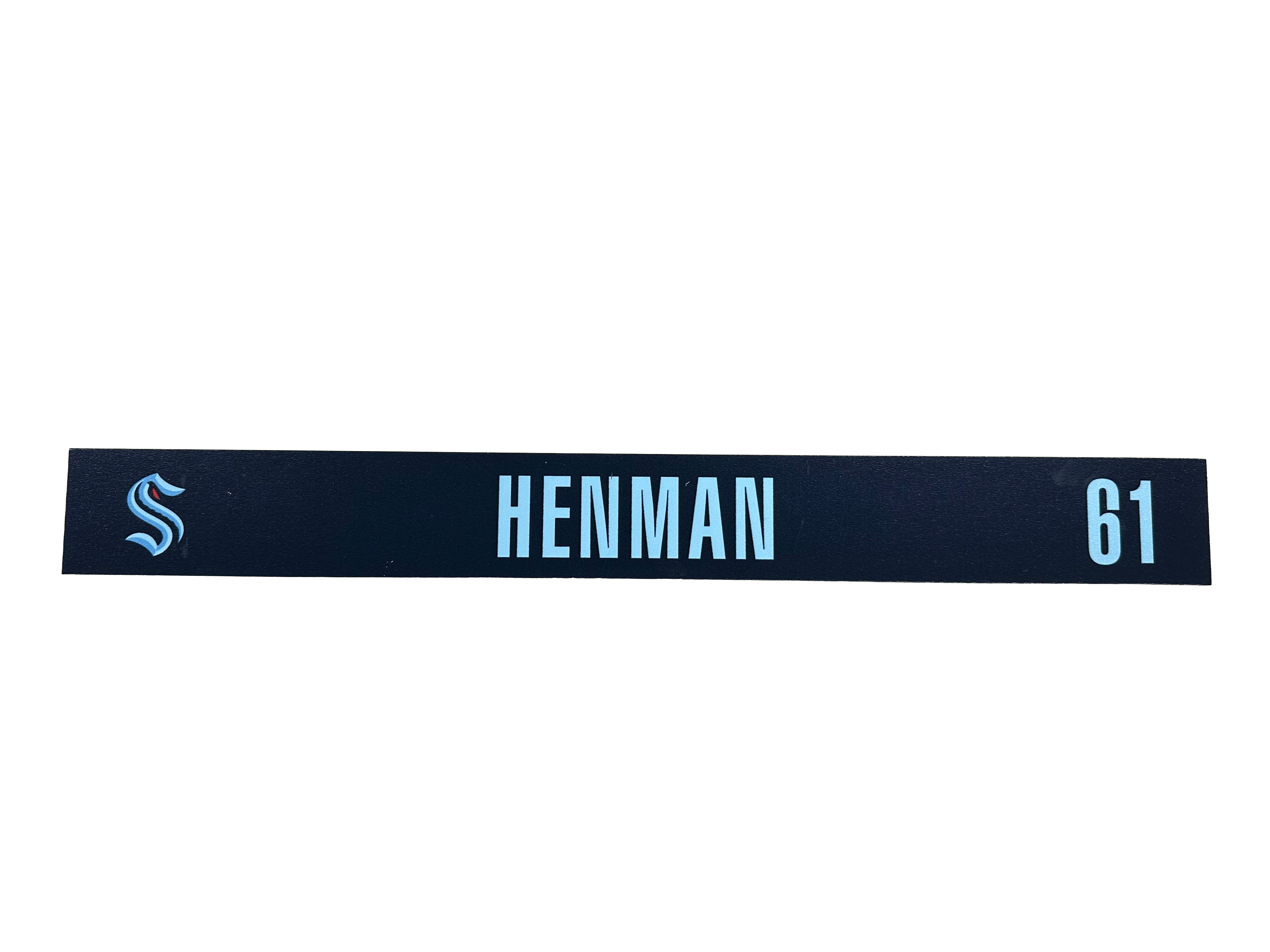 Details: Features the Seattle Kraken logo and players's name as displayed above their locker during the season.
