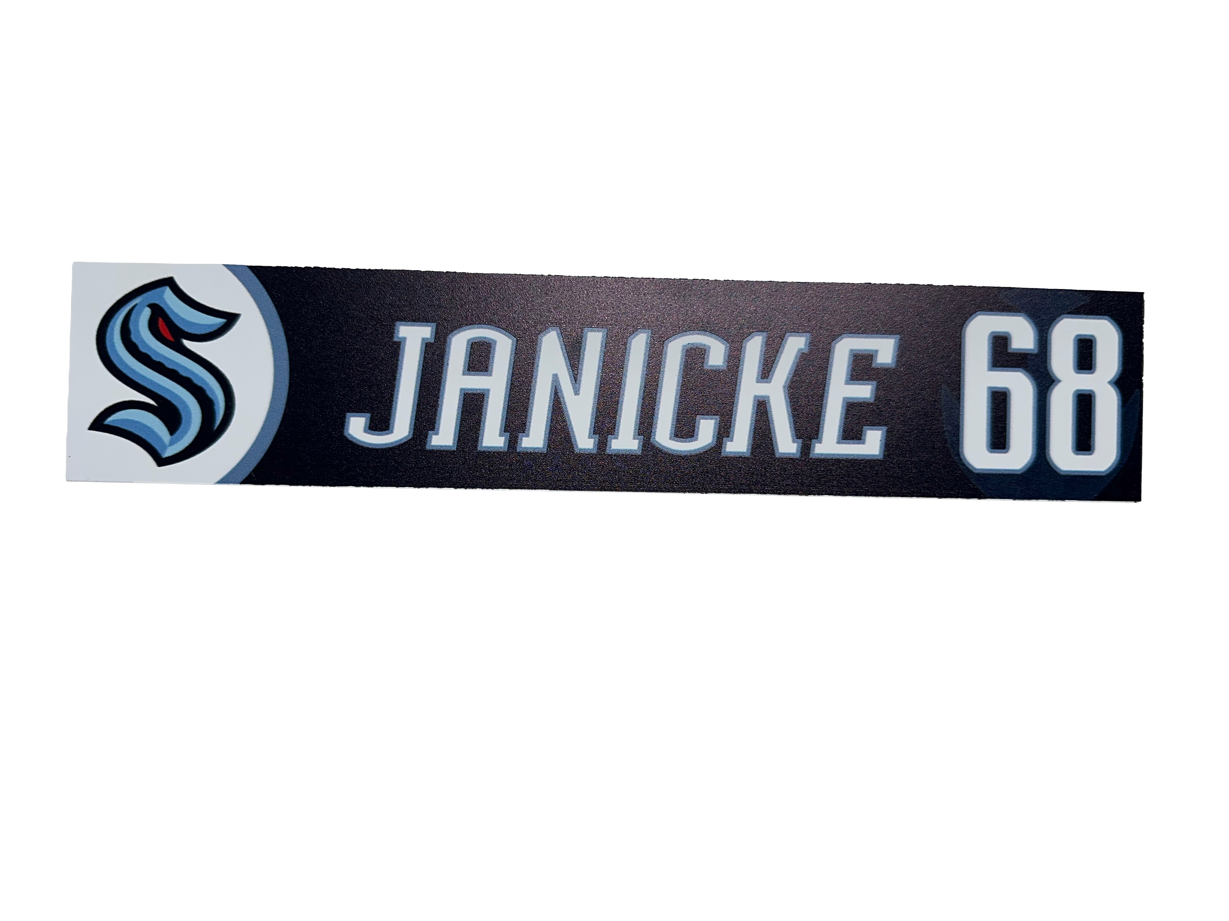 Details: Features the Seattle Kraken logo and player’s name/number as displayed above their locker during the season.