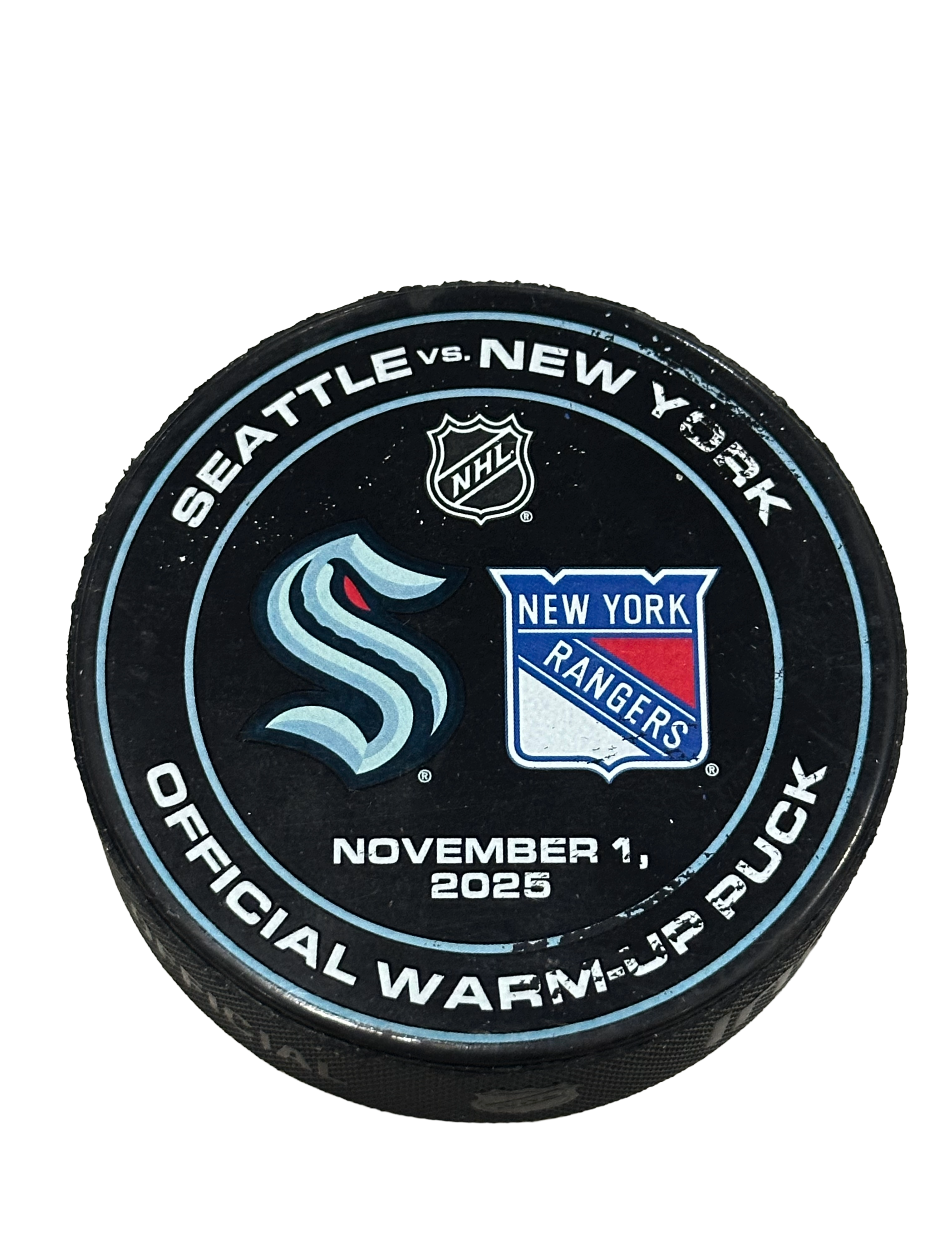Official warmup puck from the Seattle Kraken’s game against the New York Rangers on November 1st, 2025. This high-quality collectible puck is the perfect addition for collectors and Kraken fans looking to own a piece of Kraken history.