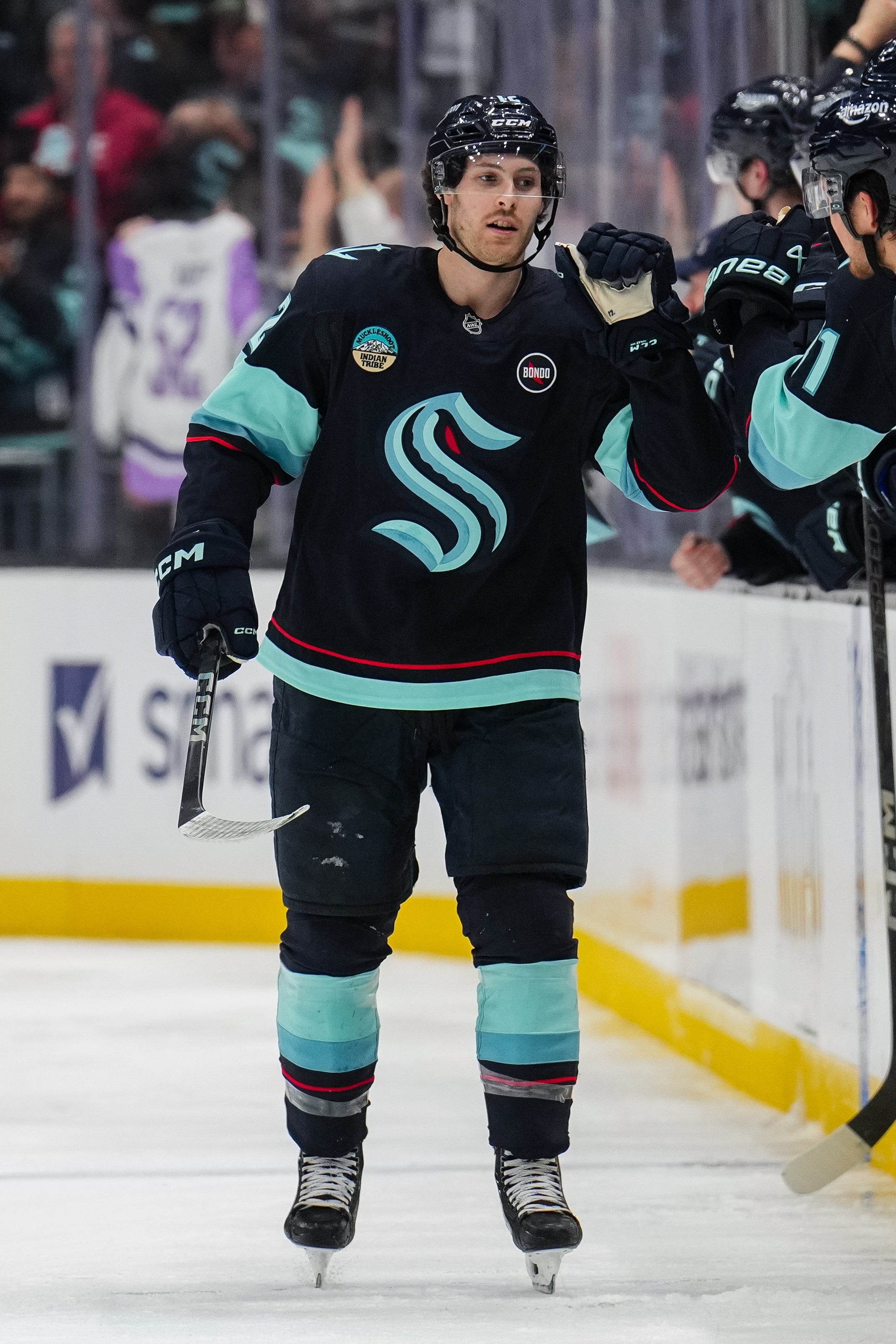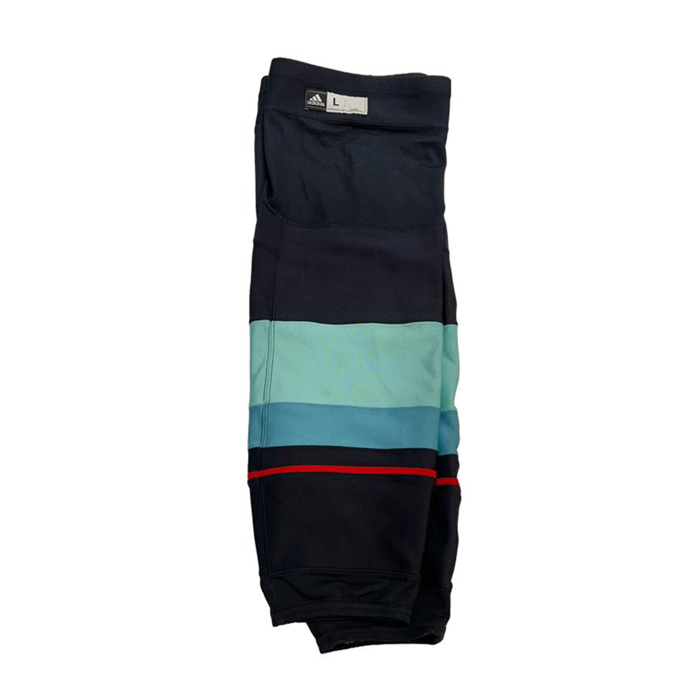 Official Seattle Kraken player worn Navy Home Socks (Size Large). Made in Canada, these high-quality hockey socks make a perfect addition for collectors and Kraken fans looking to own a piece of Kraken history.