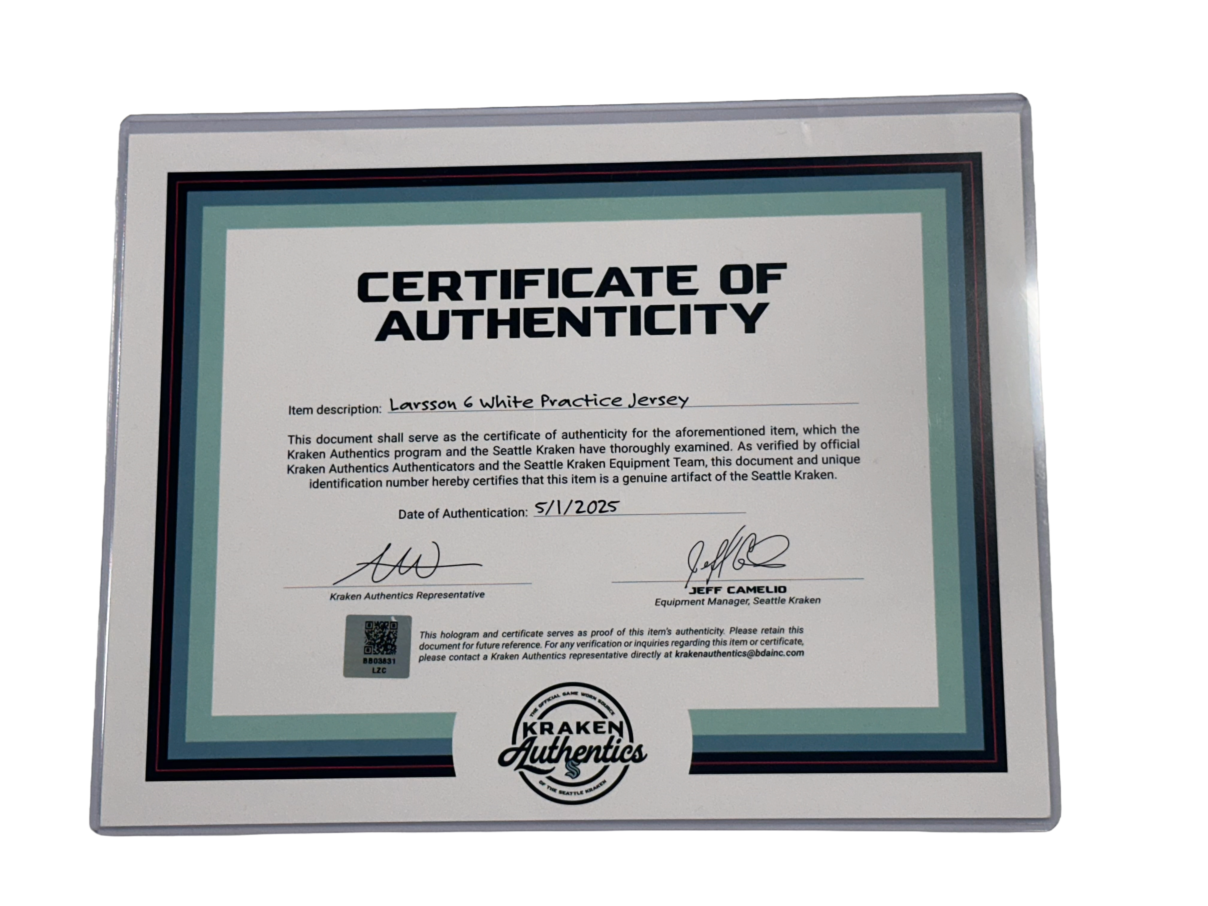 Each jersey includes an official Kraken Authentics Certificate of Authenticity, verifying that this is a genuine team-worn item.