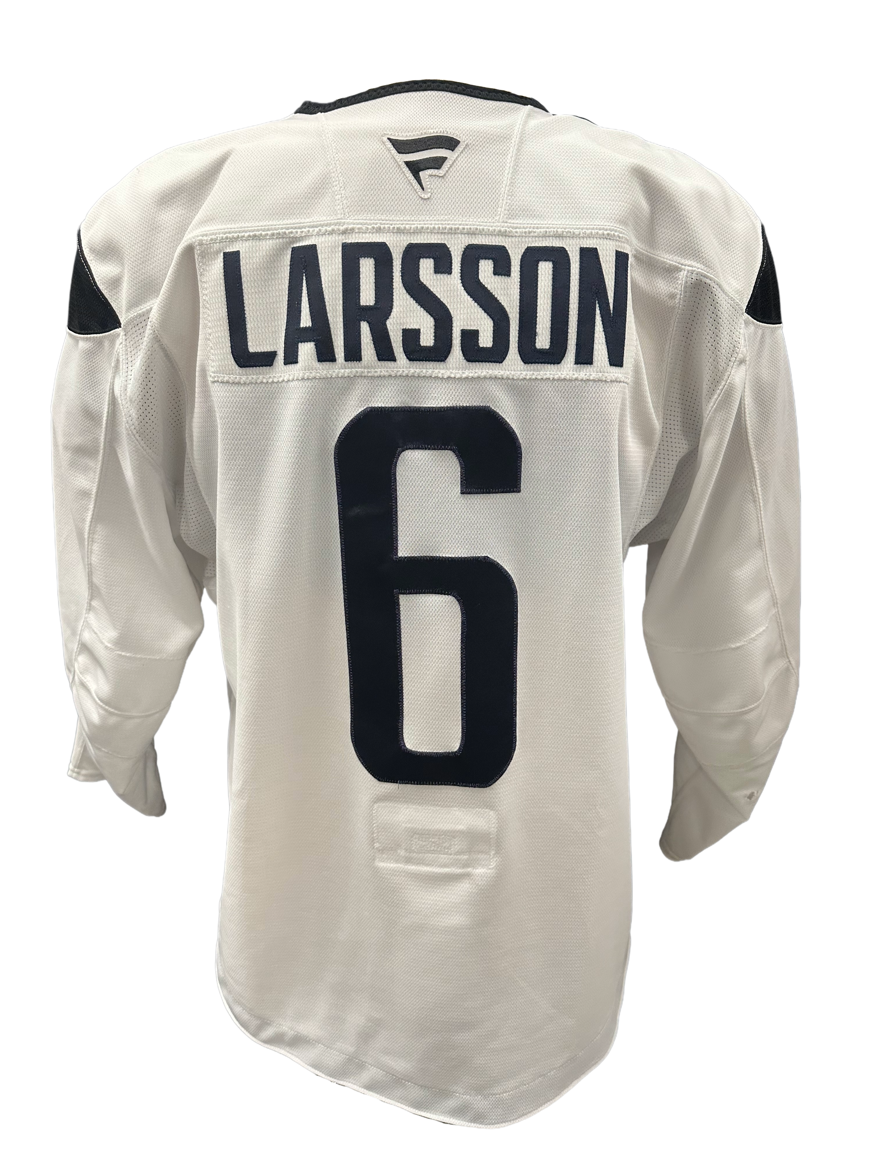 This official Seattle Kraken practice jersey was worn by Adam Larsson during team practices and training sessions. As a genuine used team-issued item, it may display visible signs of wear such as puck marks, board paint, minor fabric wear, or other authentic use from on-ice action.