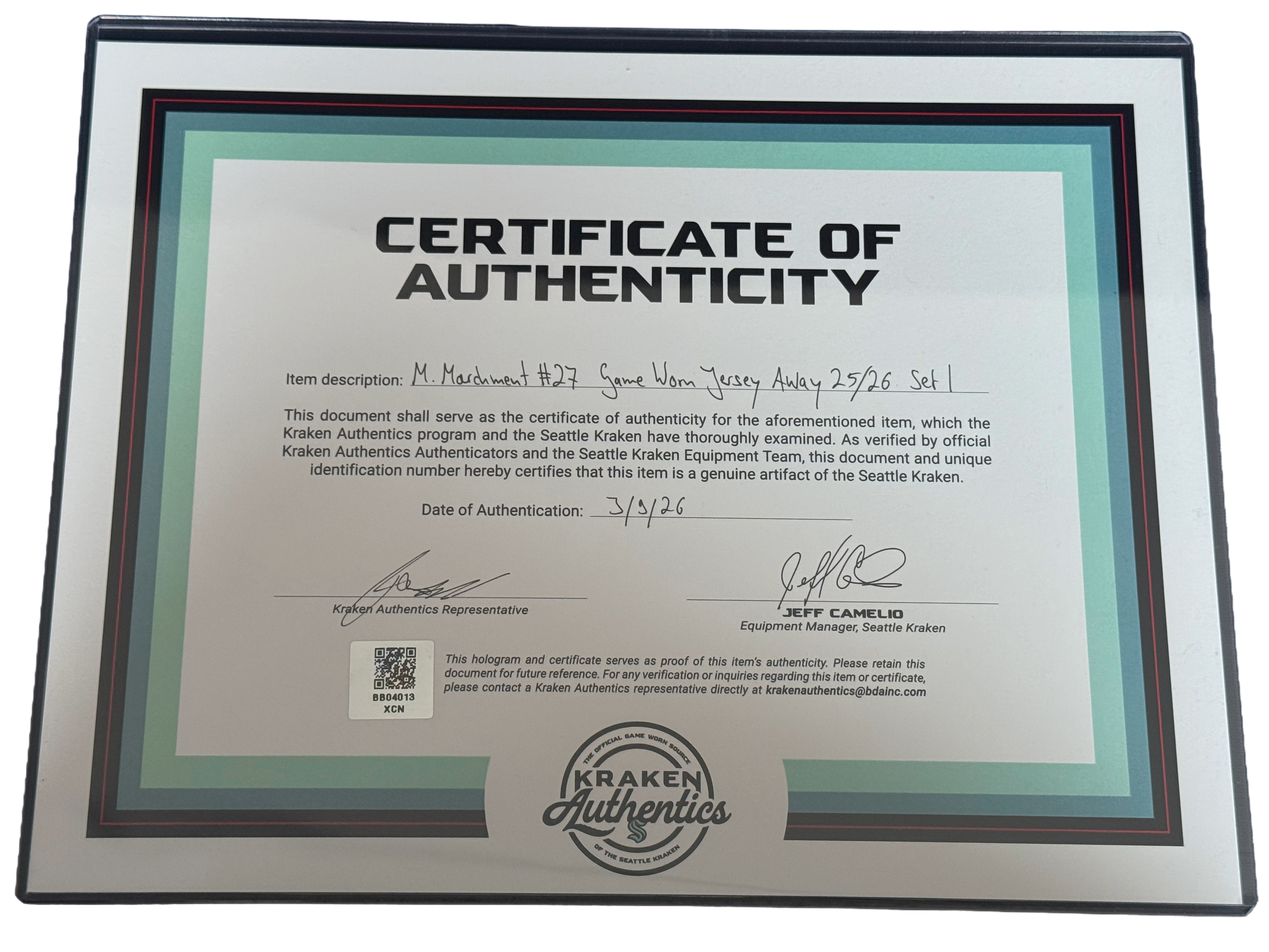 The jersey is part of the Kraken Authentics online auction. Select jerseys from this auction will be displayed at the Kraken Authentics shop located behind Section 108 at Climate Pledge Arena during the auction period.