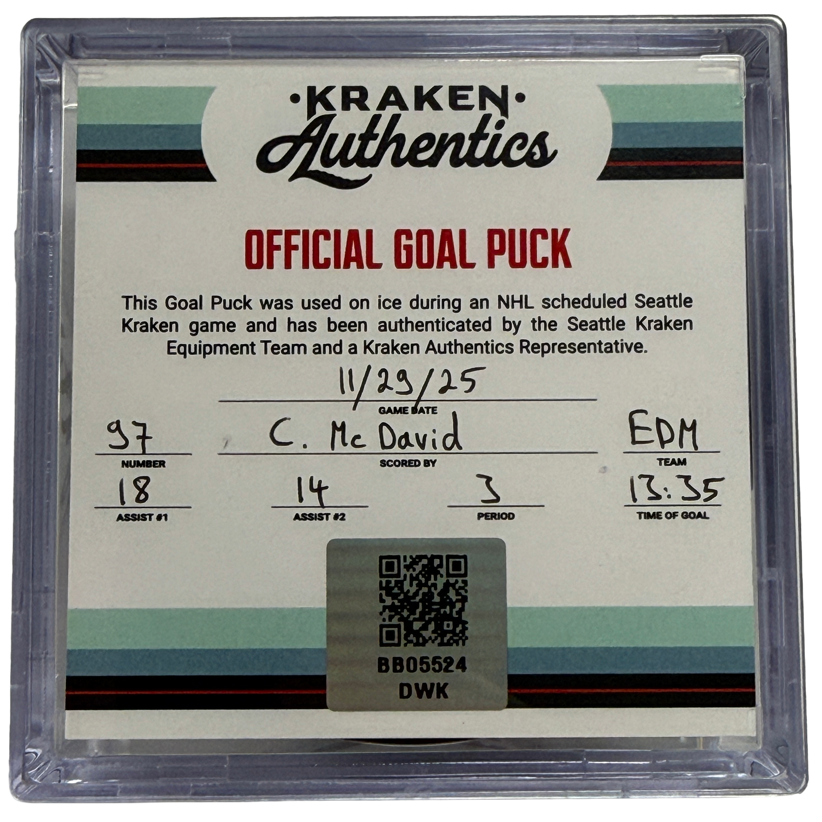 Official goal puck from the Seattle Kraken vs. Edmonton Oilers game on November 29, 2025.