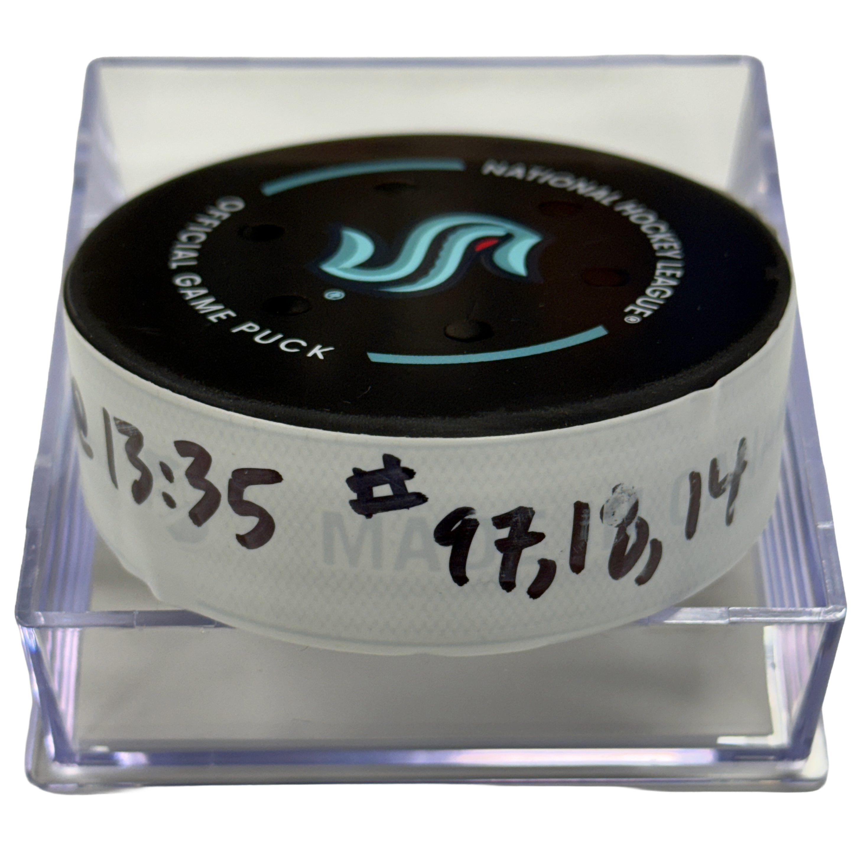 Other warm-up, game-used, and goal pucks from this game are also available through Kraken Authentics (subject to availability).