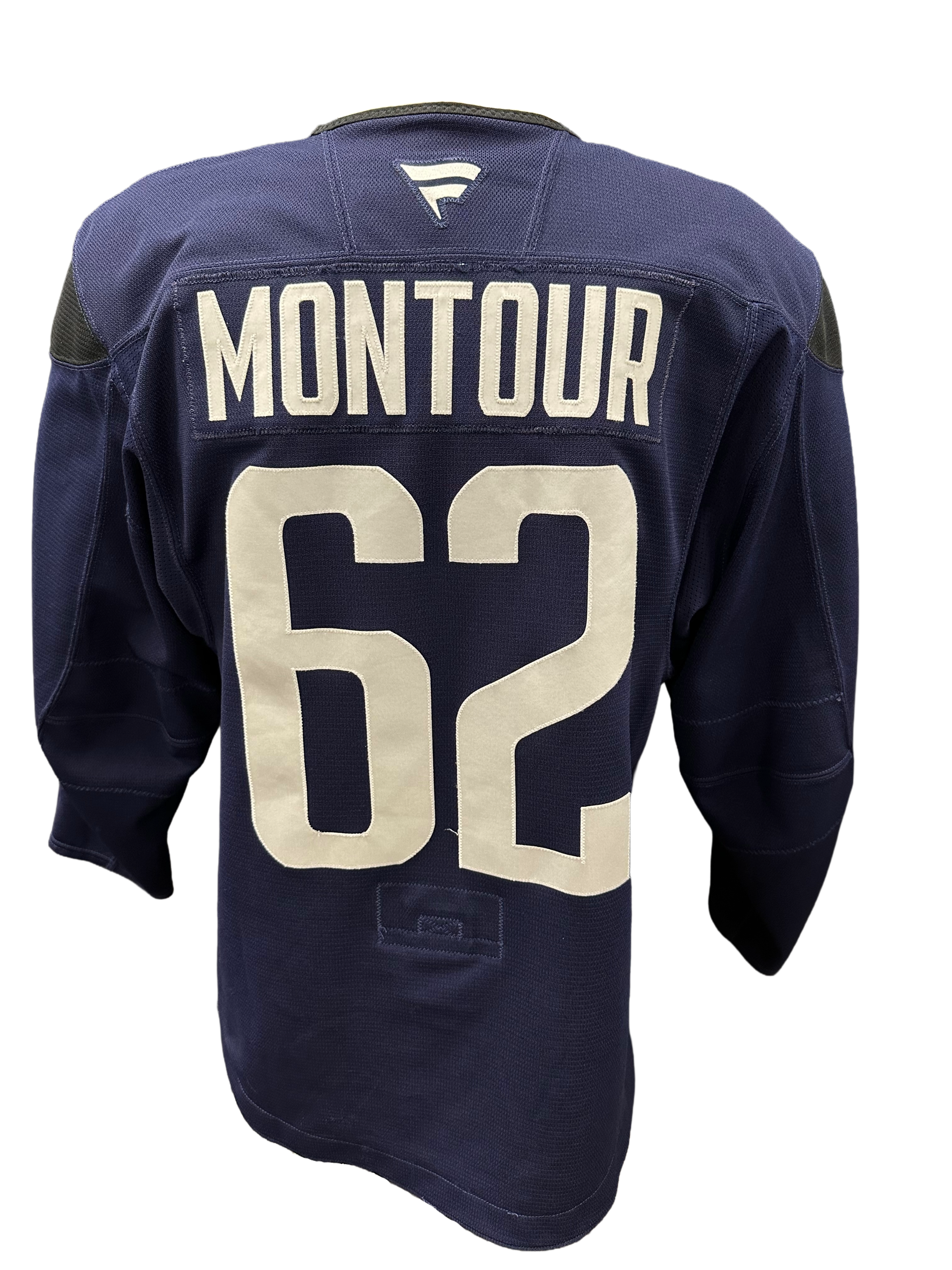 This official Seattle Kraken practice jersey was worn by Brandon Montour during team practices and training sessions. As a genuine used team-issued item, it may display visible signs of wear such as puck marks, board paint, minor fabric wear, or other authentic use from on-ice action.