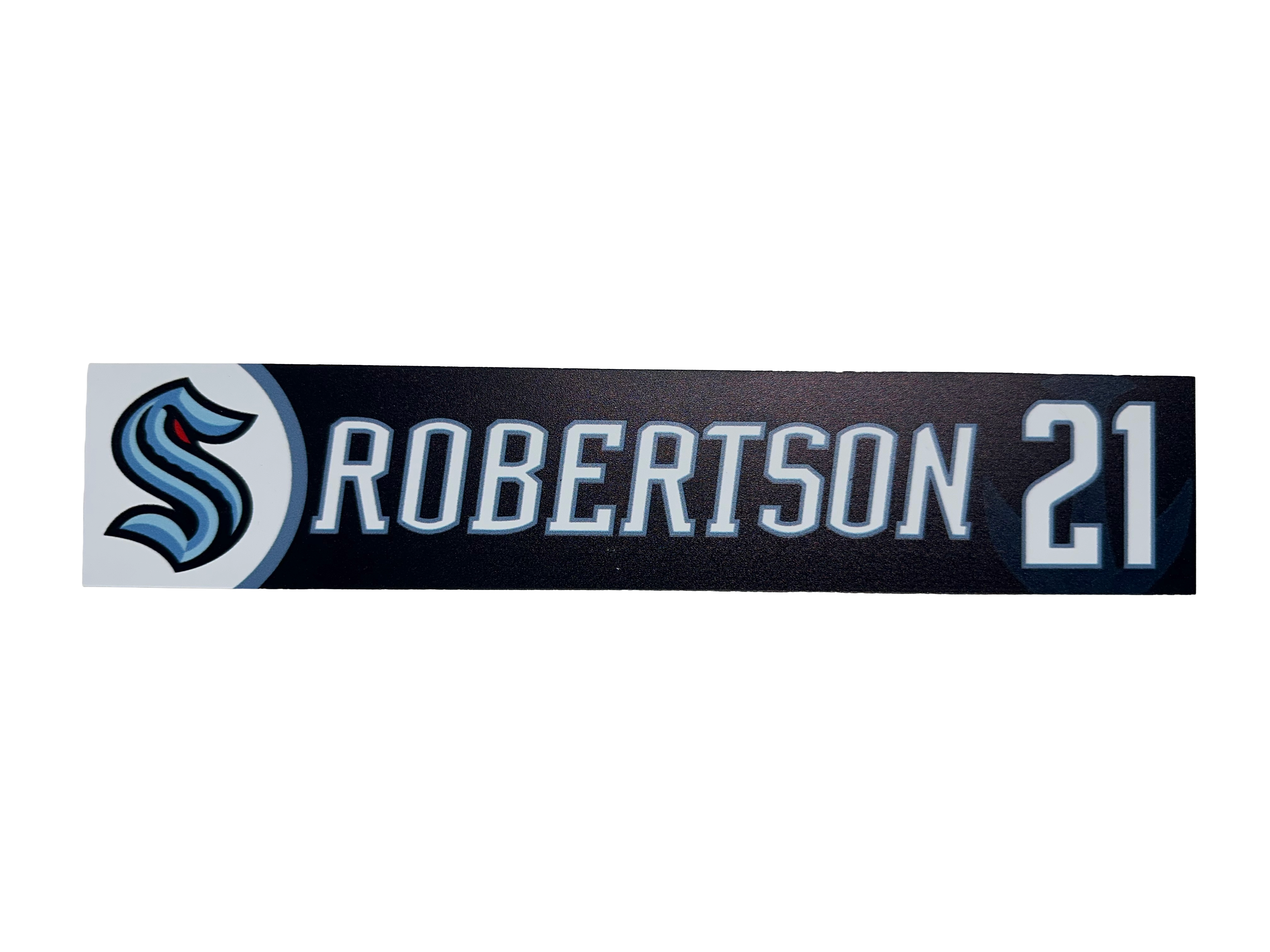 Details: Features the Seattle Kraken logo and player’s name/number as displayed above their locker during the season.