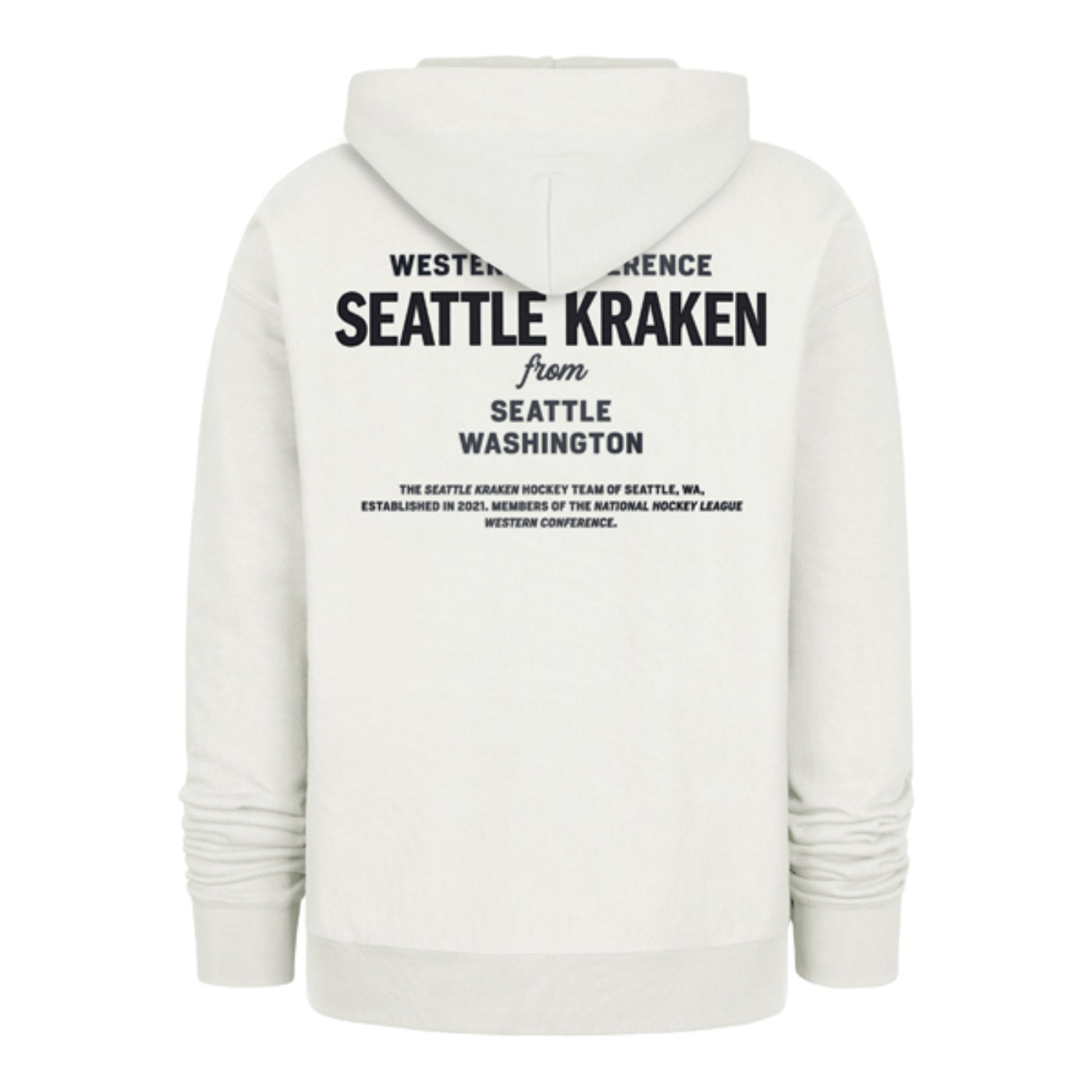 Represent your Seattle Kraken with this classic '47 hoodie. The Kraken primary logo sits prominently on the left chest, while the back features bold "Western Conference Seattle Kraken from Seattle Washington" lettering. Perfect for game days or everyday wear, this hoodie combines team pride with comfortable style. A must-have for dedicated Kraken fans.