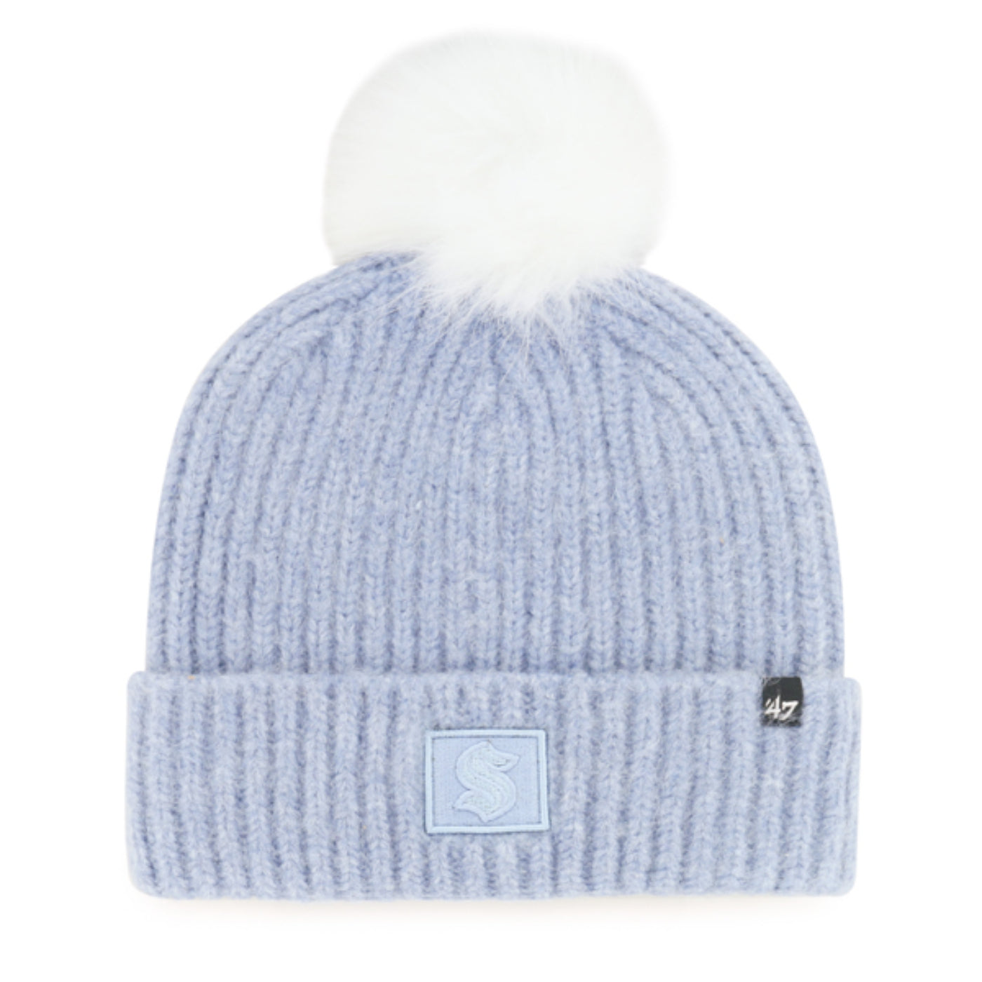 Stay warm and show your Kraken pride with this cozy '47 cuff knit beanie. Featuring a soft mellow mist blue colorway and a classic pom on top, it's the perfect way to rep Seattle hockey through chilly Pacific Northwest winters. Whether you're heading to Climate Pledge Arena or just braving the cold, this beanie keeps you comfortable while displaying your team loyalty in style.
