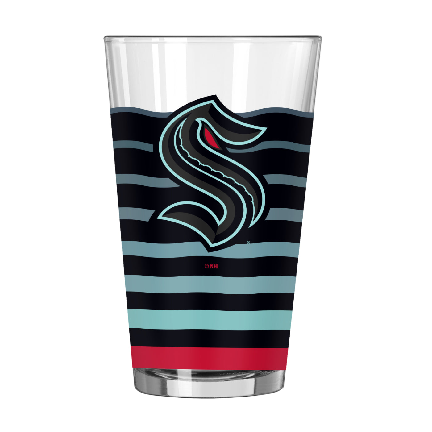 Raise a glass to the Kraken with this 16 oz. pint glass featuring the dynamic waves design from Seattle's legendary third jersey. Perfect for game day celebrations, post-victory toasts, or just sipping your favorite beverage in style. The bold wave pattern captures the intensity of the ice while keeping your team colors front and center. Durable and dishwasher-safe, this glass is built to handle the rowdiest of hockey celebrations. Show your Kraken loyalty with every sip!