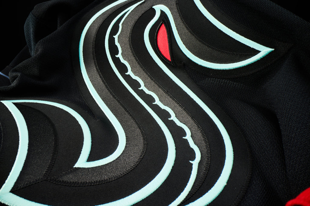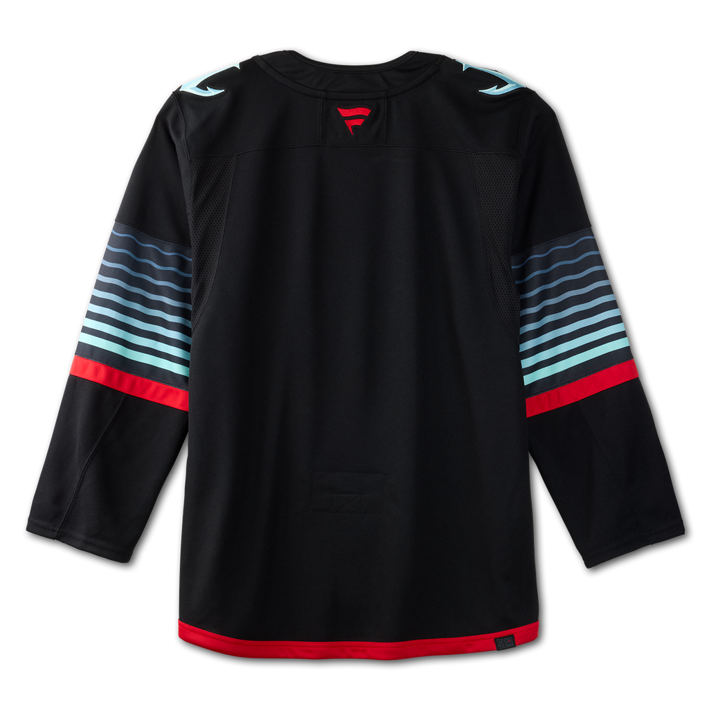 This is the Kraken’s first-ever third jersey, a bold new design that pushes boundaries while staying true to the mystery of the deep. This all-black kit is inspired by the eerie depths of the Pacific Northwest, featuring an Ice Blue, glow-in-the-dark crest outline that mirrors the region’s natural bioluminescence. With glow effects on the shoulders, numbers, and names, the jersey delivers a look that’s as striking as it is unsettling under the lights. Designed to be both menacing and beautiful, this innovative piece represents the team’s next evolution and is built for fans ready to stand out in the dark.