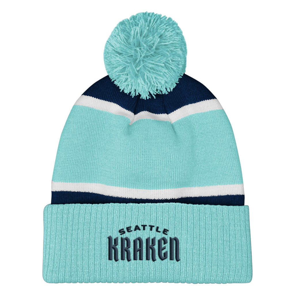 Keep cozy and cool with the Seattle Kraken Girls Ice Blue Cuffed Pom Beanie! This playful beanie pairs an eye-catching ice blue color with a fun pom pom on top, adding a splash of team spirit to every chilly day. Perfect for young fans who want to stay warm while showing off their Kraken pride in style.