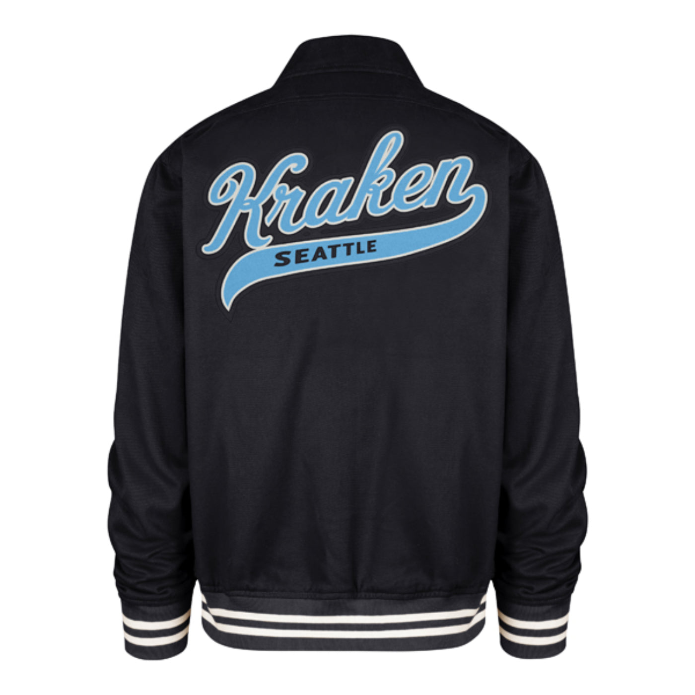 Rock the waters in this Seattle Kraken Homestead Jacket, featuring the team's iconic primary logo embroidered on the left chest and bold college-style Kraken lettering across the back. Perfect for showing your deep-sea pride whether you're heading to Climate Pledge Arena or just dominating the streets. This jacket brings that classic varsity energy with a modern hockey edge—because true fans wear their allegiance loud and proud.