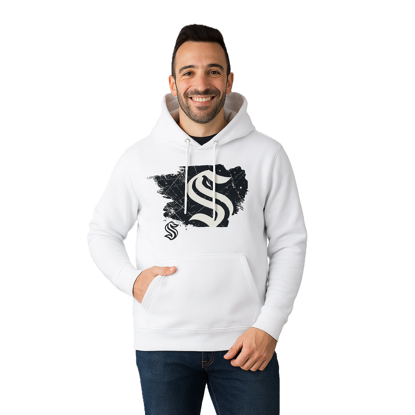 Update your casual collection with this Seattle Kraken Ice White Podium hoodie, designed for everyday comfort and functionality. It features a three-panel hood that offers a snug fit and substantial coverage. The front kangaroo pocket provides convenient storage for personal items, while the soft brushed interior ensures extra warmth. Adjustable draw cords with durable plastic-tipped ends allow for a customizable fit. The ribbed band at the waist and cuffs helps to maintain a secure fit, keeping the elements out. Made from a blend of 80% Cotton and 20% Polyester, this hoodie is both durable and easy to maintain, ideal for daily wear.