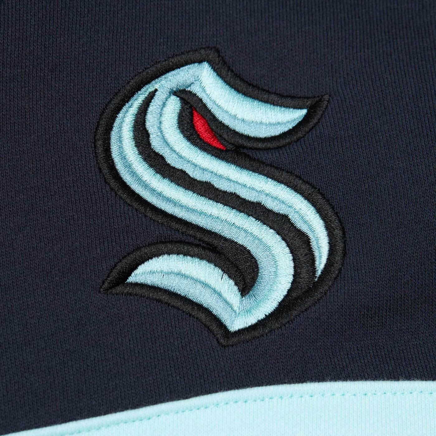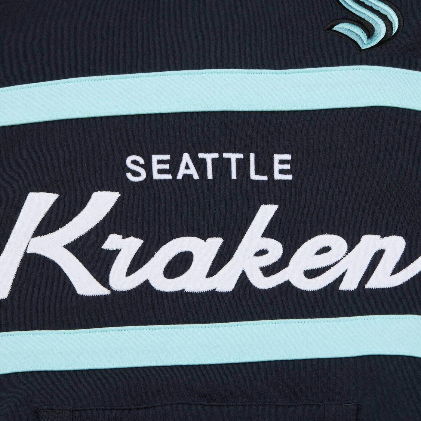 Represent your Seattle Kraken pride with this classic Mitchell & Ness Head Coach hoodie. Featuring the iconic Kraken logo embroidered on the upper left chest and bold "Seattle Kraken" script across the chest, this navy hoodie combines vintage sportswear style with team spirit. Perfect for game days or casual wear, it's a must-have for dedicated fans looking to show their support in timeless fashion.