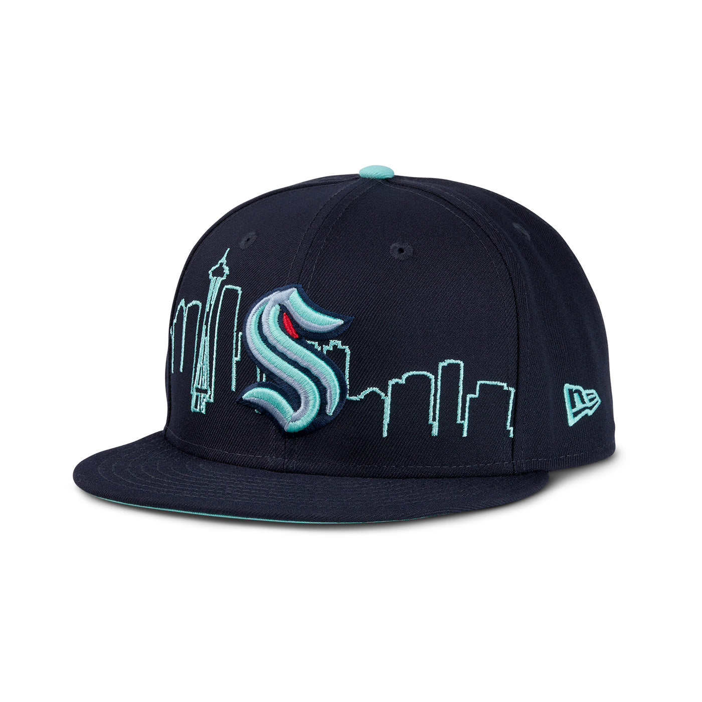 Rep your city and your team in bold style with the Seattle Kraken Navy Skyline Primary New Era 59FIFTY Fitted Hat. This sleek cap features the Kraken’s striking primary logo embroidered on the front, backed by a crisp outline of the iconic Seattle skyline—including the Space Needle—for a truly hometown look. On the back, “SEA” is stitched in teal and ice blue adding a fierce finishing touch. Crafted in deep navy with a structured fit and flat bill, this hat delivers both sharp style and true team pride for every Kraken fan.