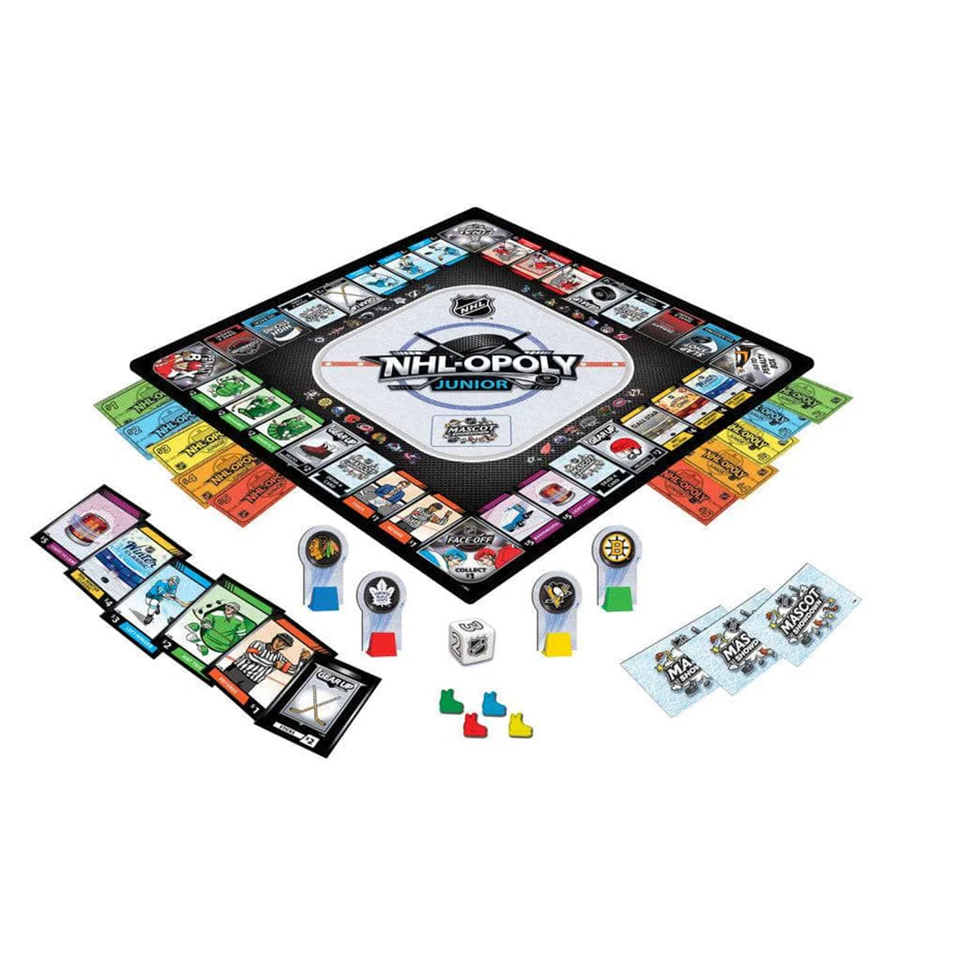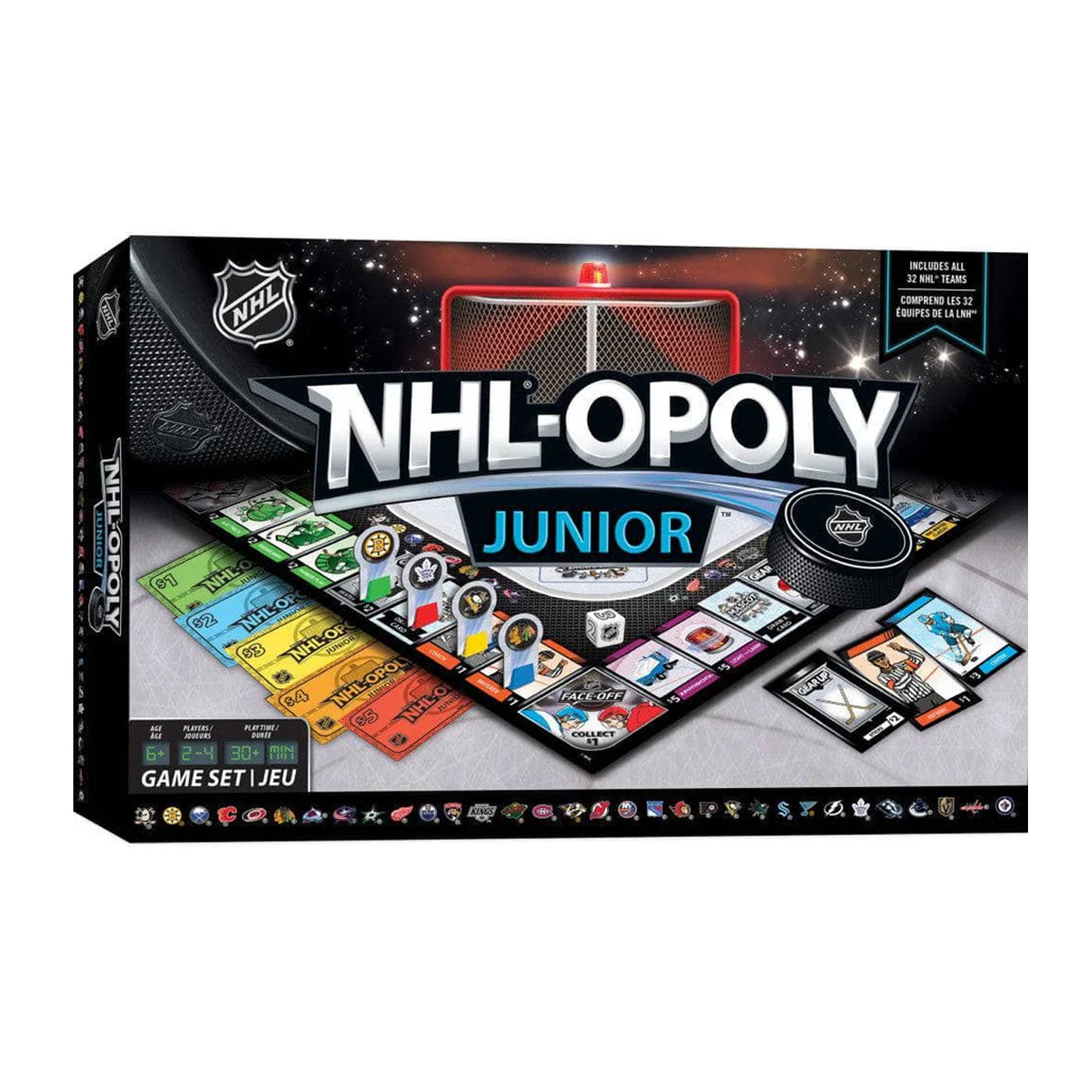 Puck drop! Choose from all 31 NHL® teams to create your custom playing piece with our reusable, static-cling stickers. Just peel and stick the logo stickers of your favorite teams, and you're ready to hit the ice! Get ready for NHL Face-Off™, collect key positions, equipment, and players as you go around the board. Make trades during NHL Scouting Combine TM and NHL Draft™, and collect groups of the same color to earn more money. Just be sure to avoid the Penalty Box! Go to the Stanley Cup® Final and win big with NHL®-OPOLY JUNIOR!