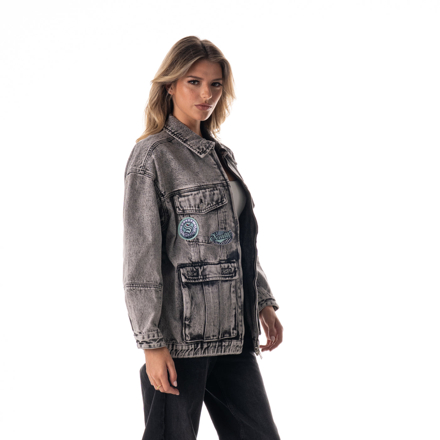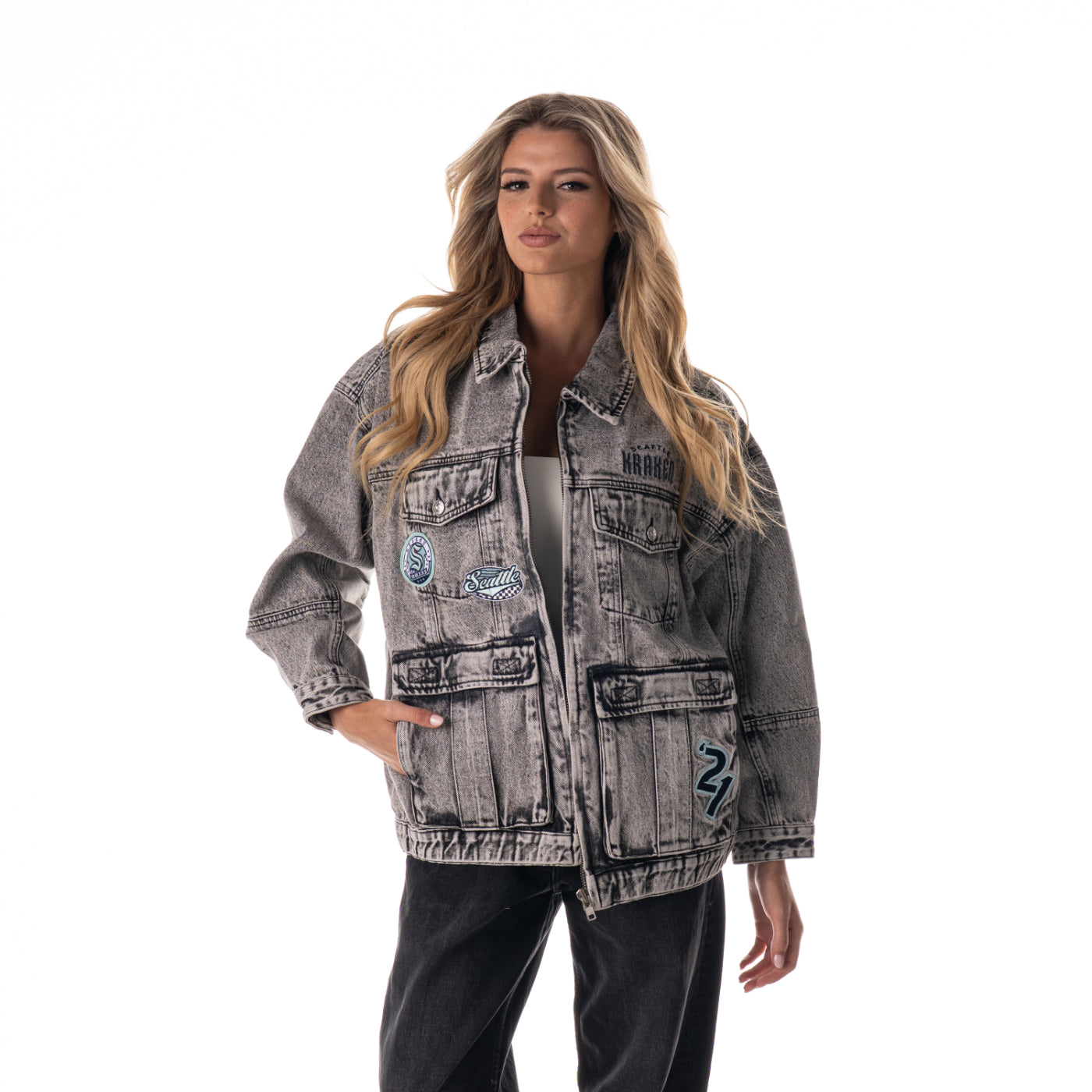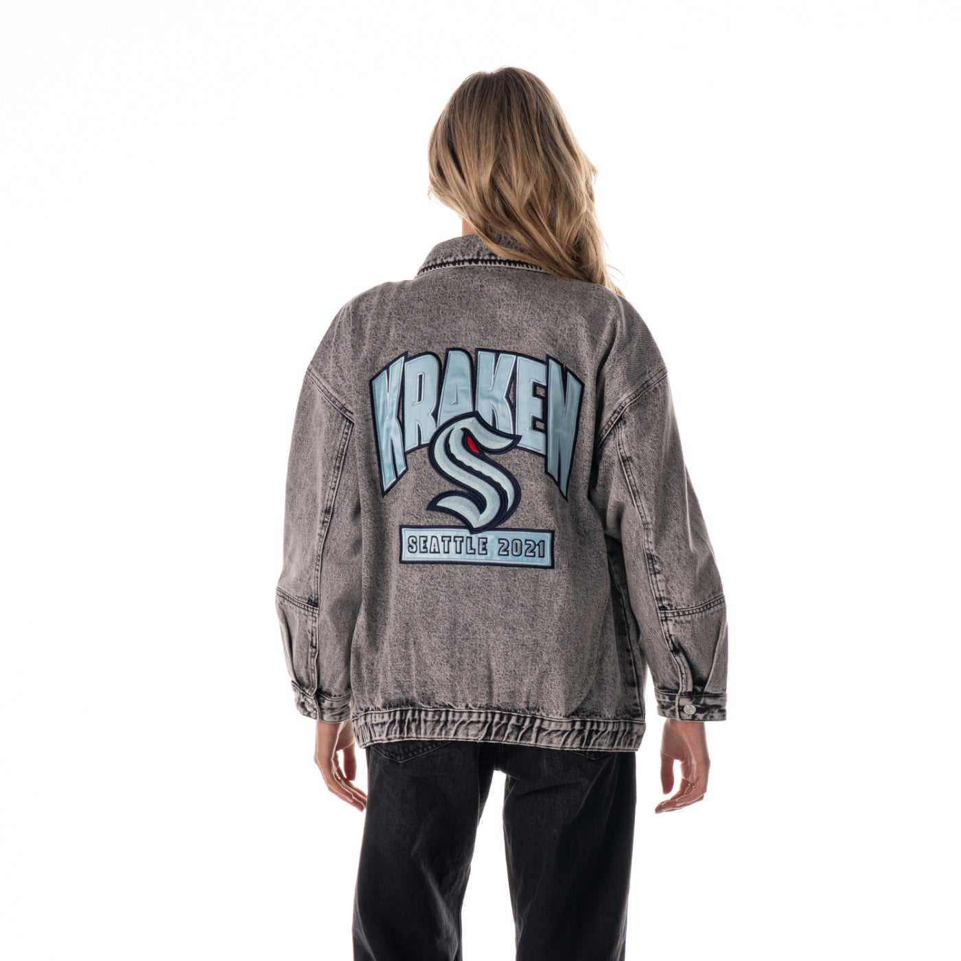Rock the waters in style with this Seattle Kraken oversized denim jacket. Featuring bold team graphic patches and that perfectly slouchy fit, it's your ticket to looking effortlessly cool whether you're heading to the game or just repping your squad around town. The classic denim construction keeps things timeless, while the roomy cut makes it ideal for layering through those Pacific Northwest seasons. Show your Kraken pride with serious swagger.