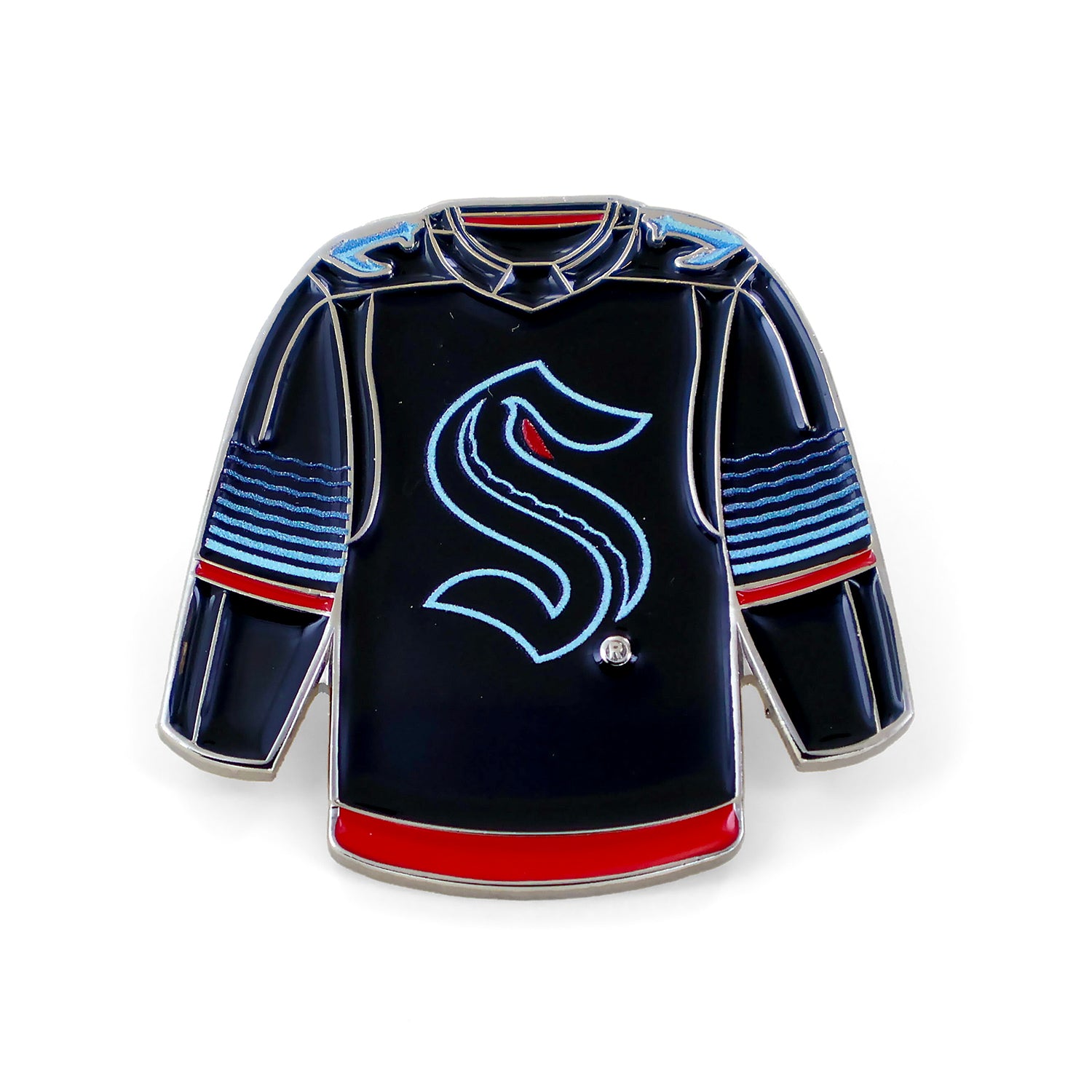 Dive deep into Kraken fandom with this vibrant third jersey pin. Featuring the team's striking alternate design, this collectible enamel pin is perfect for customizing your gear, displaying on your collection board, or trading with fellow fans. Whether you're pinning it to your backpack, jacket, or hat, this little piece of Seattle hockey spirit packs major style. Grab yours and show the league what you're made of!