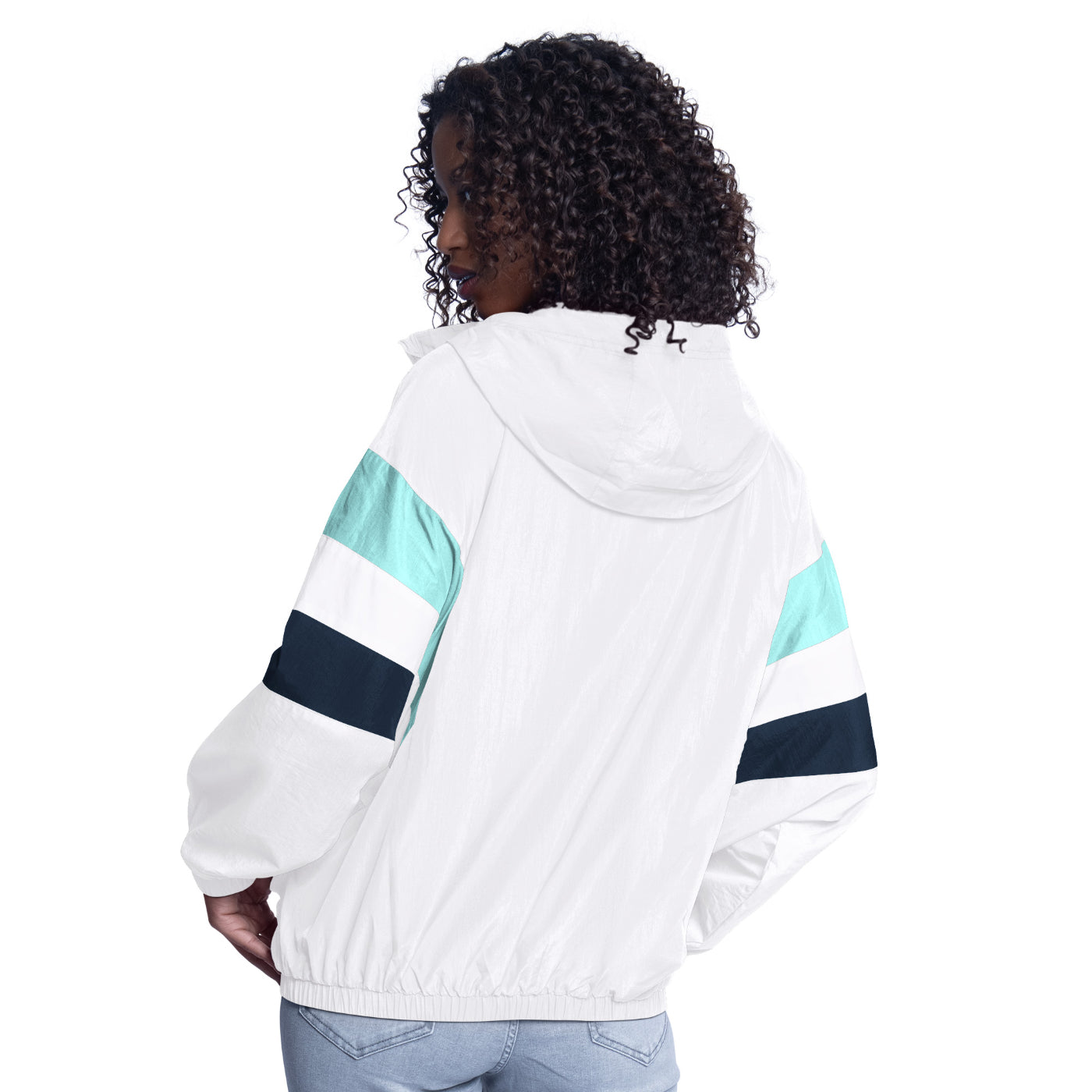 Stay stylish and show your Seattle Kraken pride with the Women's Game News Nylon Jacket. Designed for comfort and versatility, this lightweight windbreaker features a sleek white base with bold team-inspired accents in deep navy, teal, and white. The full-zip front allows for easy layering, while the high collar and adjustable drawcords offer added protection against the elements. The Seattle Kraken logo on the chest adds an authentic touch, making it perfect for game days, casual outings, or everyday wear. With a relaxed fit and elastic cuffs for a secure feel, this jacket is a must-have for any Kraken fan looking to combine fashion and fandom.